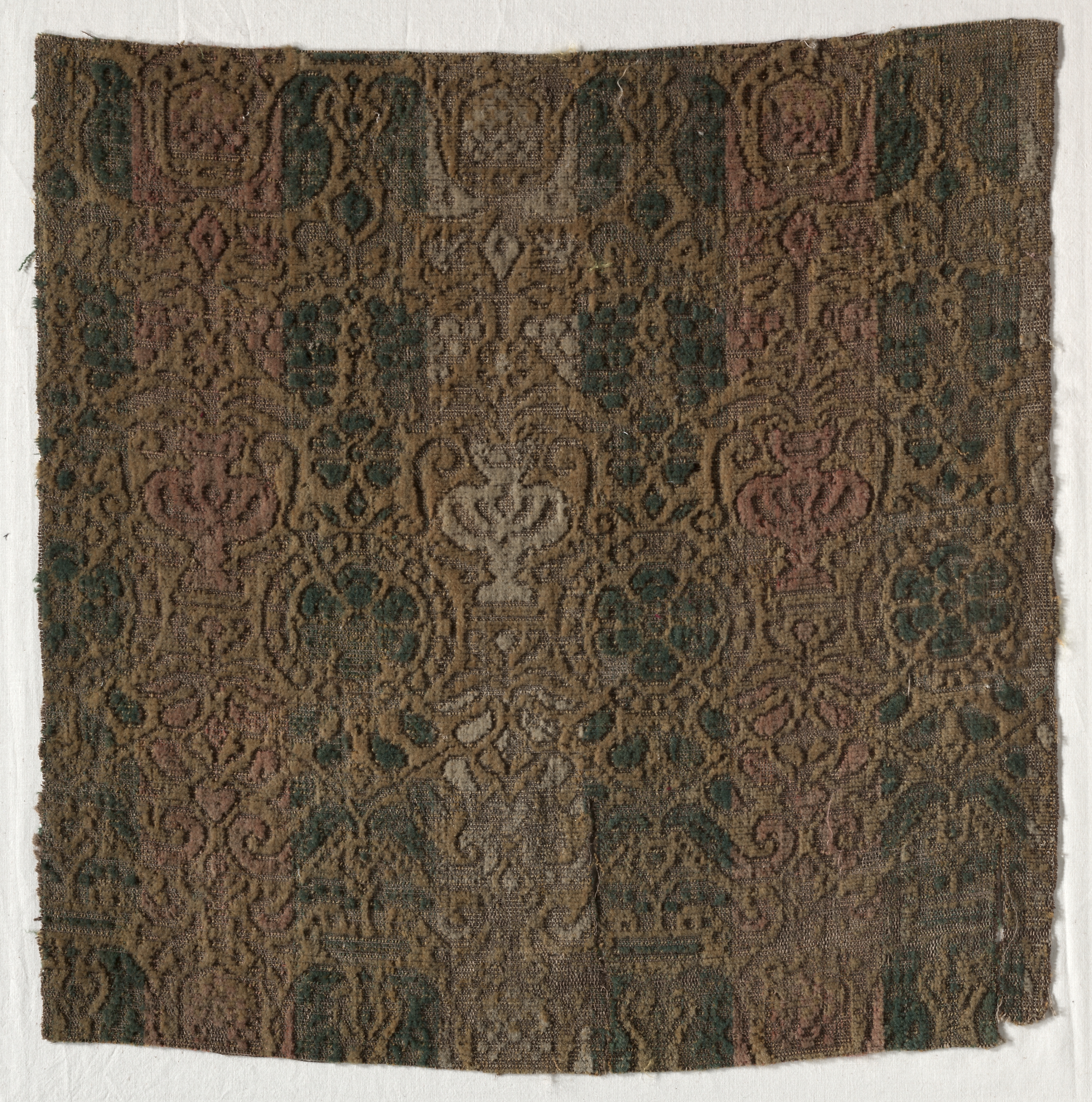 Brown velvet fabric with a repeating design in shades of brown, green, and pink. The fabric is square-shaped with frayed edges. The design features intricate patterns with teardrop shapes and curved lines. The fabric appears to be old and worn, with visible signs of aging. The background behind the fabric is white. Title: Velvet.