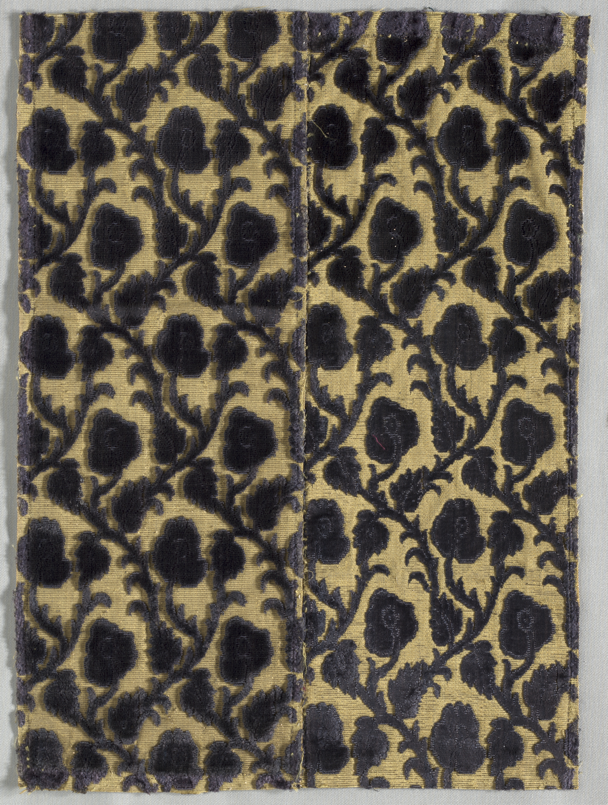 Brocade textile by artist. The image shows a square piece of fabric with a repeating pattern. The fabric is gold with a black floral design. The flowers are large and have many rounded petals. The stems and leaves are thin and curved. The background of the fabric is gold. The fabric has a thick, woven texture. The edges of the fabric are rough and uneven. The fabric is set against a light gray background. The fabric takes up most of the image.