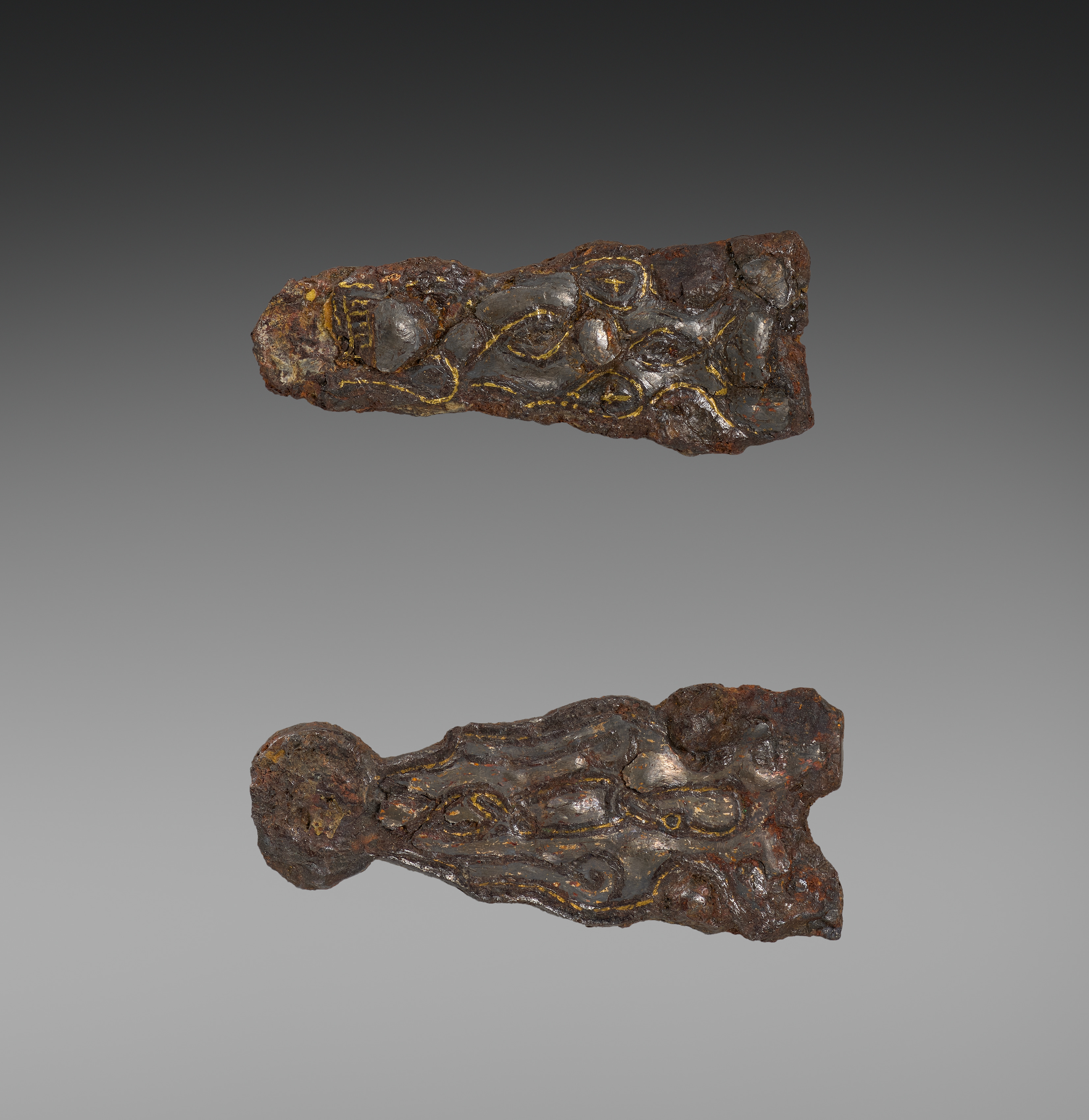 Title: Buckles Artist: Unspecified Two dark brown, rusted metal buckles with a rough texture and gold accents. The top buckle is elongated and slightly curved with a rounded end on the left and a squared end on the right. The bottom buckle has a bulbous end on the left and a thinner, curved end on the right. Both buckles have a mix of smooth and rough surfaces, with visible signs of wear and tear. The background is a gradient of dark gray to light gray.