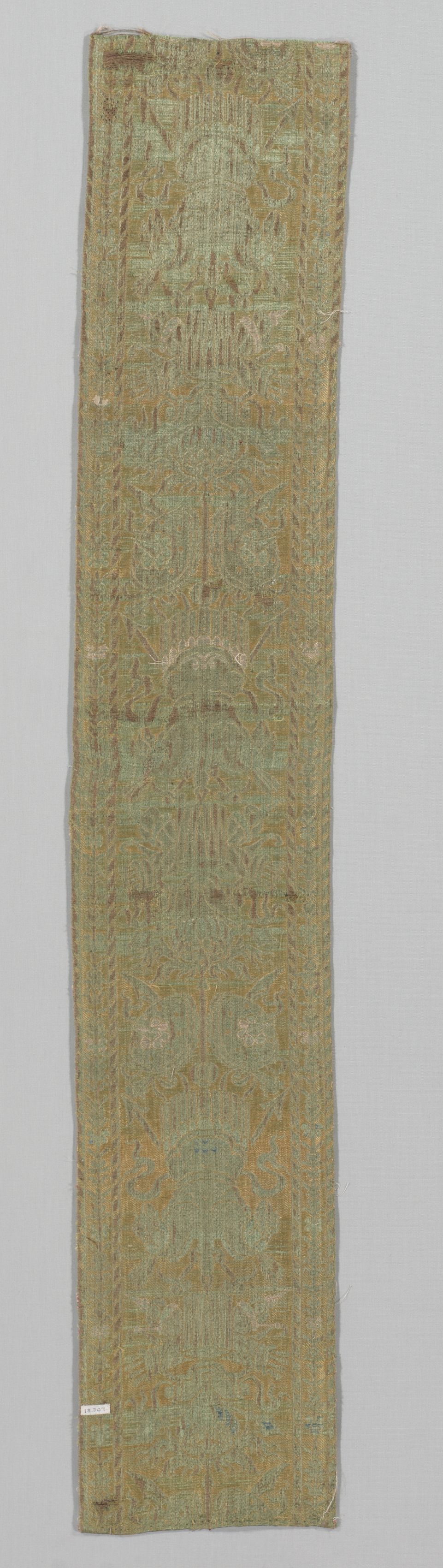 The image shows a long, narrow, rectangular piece of fabric with a green and brown color. The fabric, titled "Silk Fragment", by the artist unknown, appears to be made of silk and has a woven design. The fabric's color is primarily green with brown accents. The fabric has a repeating pattern of shapes that resemble flowers or leaves. The fabric is frayed at the edges and has a few small stains. A small white tag is attached to the bottom-left corner. The background of the image is light gray.
