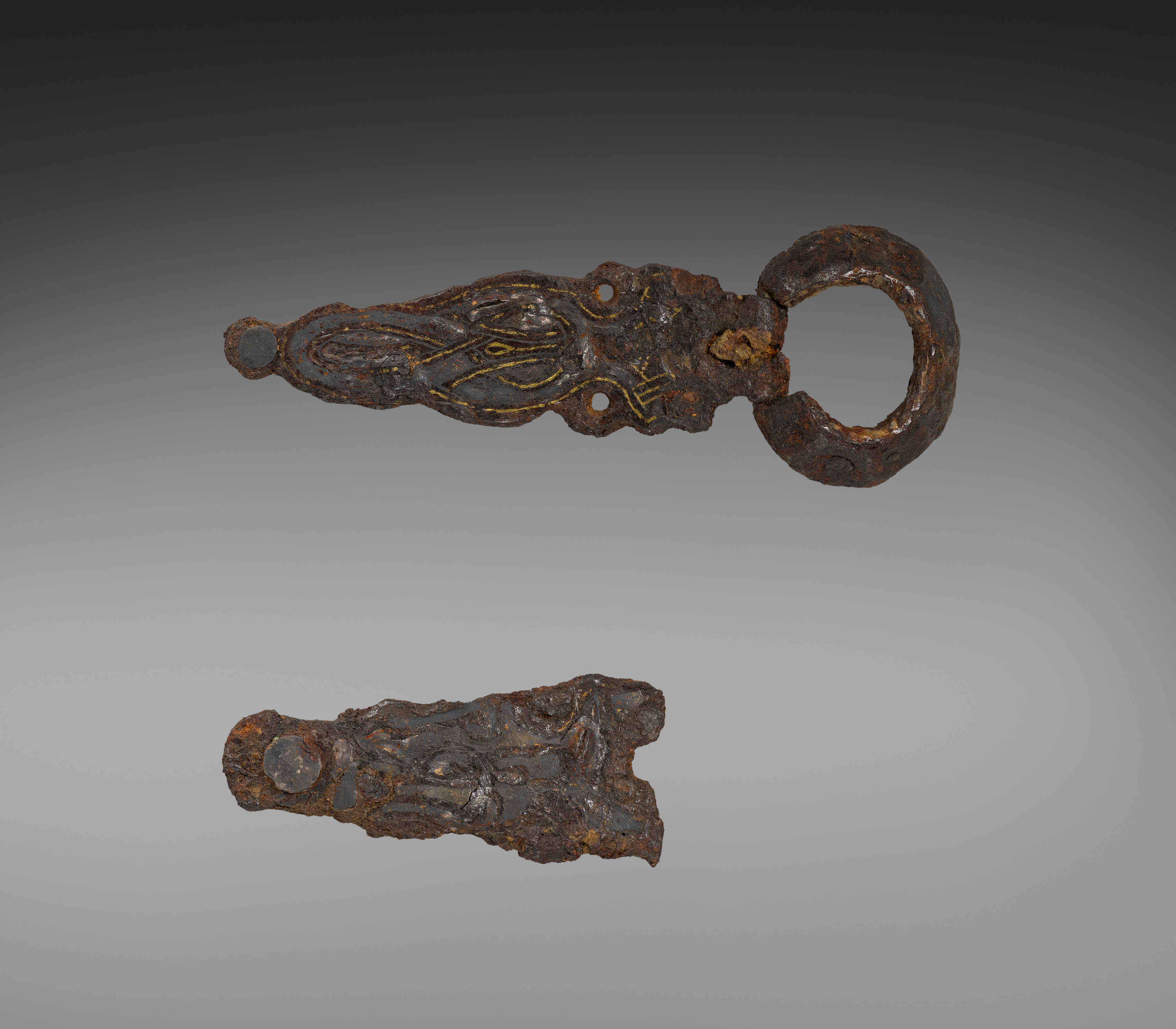 The Buckles by Kharkiv Historical Museum. Two old, rusty metal buckles. The top buckle has a long, narrow body with a loop at one end. The buckle is mostly brown with some gold etchings on its surface. The bottom buckle has a small knob on the left end and a fractured right end. The background is gray with a black vignette effect at the top.
