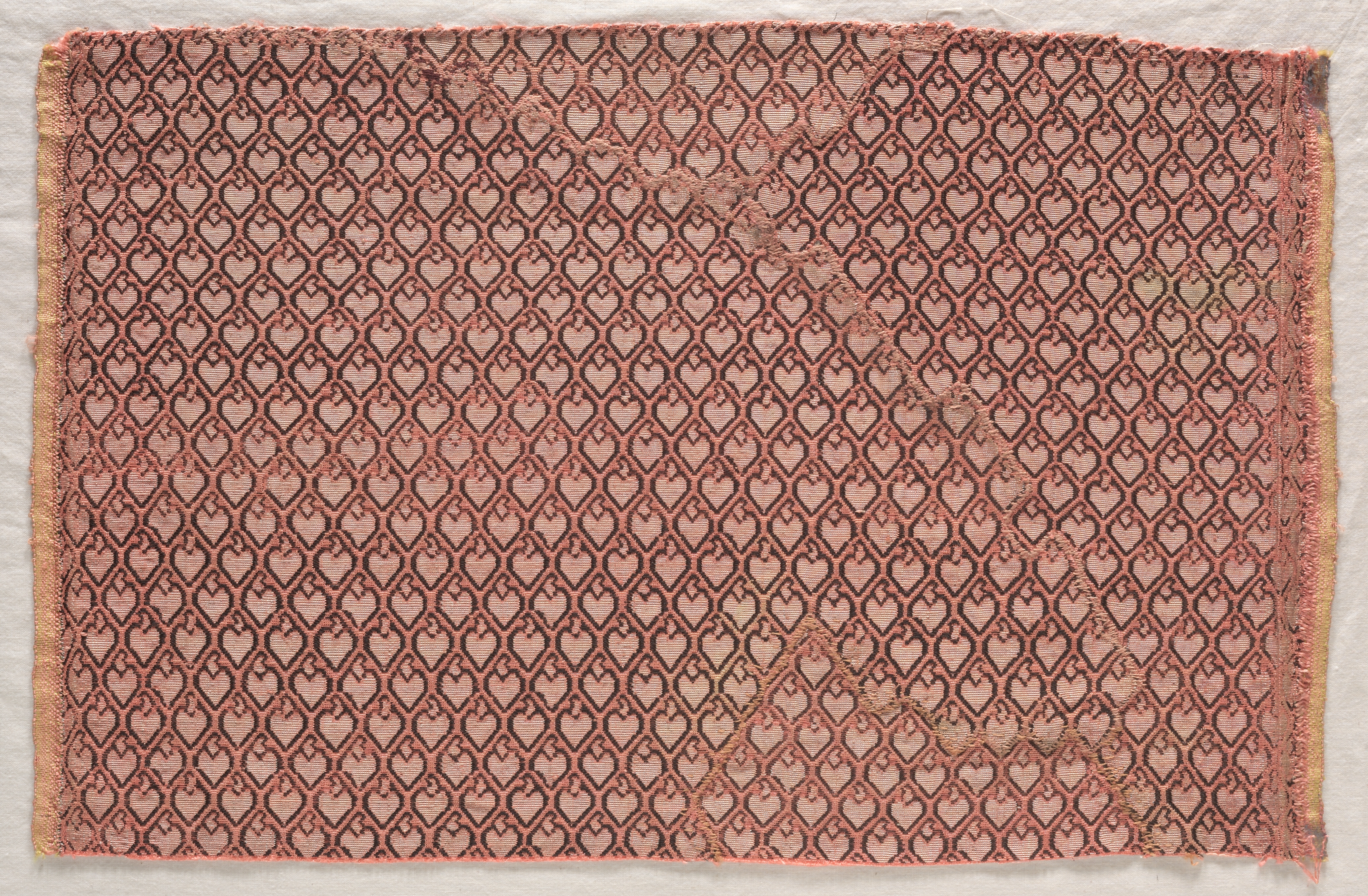 The textile, titled "Brocade Textile", has a rectangular shape with a frayed edge all around. The background color of the fabric is light pink. A dark pink and brown interlocking heart-like pattern is woven into the fabric, with the hearts pointing up and down and arranged in rows. The fabric is laid flat on a white surface.
