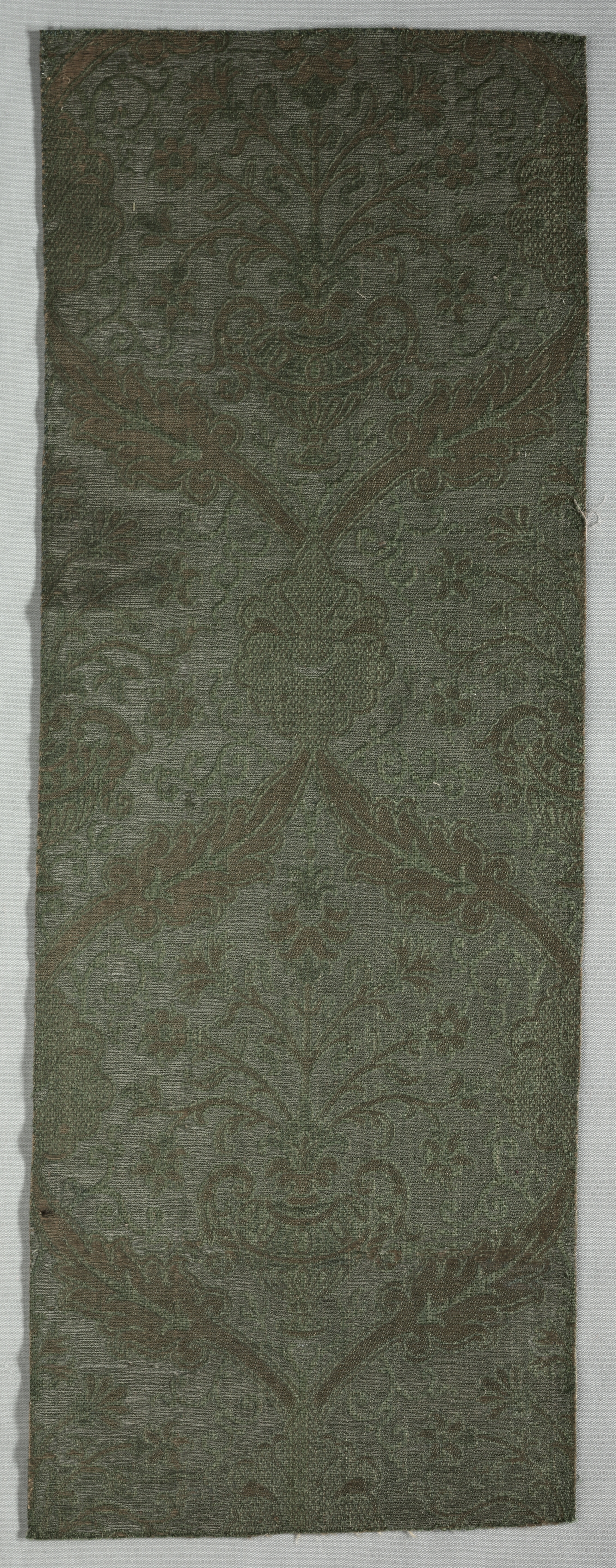 Dark green textile with brown floral pattern. The textile is rectangular with rough, uneven edges on the left and right sides. The background of the textile is dark green. The floral pattern consists of brown curved lines and shapes. The pattern repeats throughout the textile in a symmetrical arrangement. The textile is set against a light gray background. Title: Brocatelle Textile. Artist: Unknown.