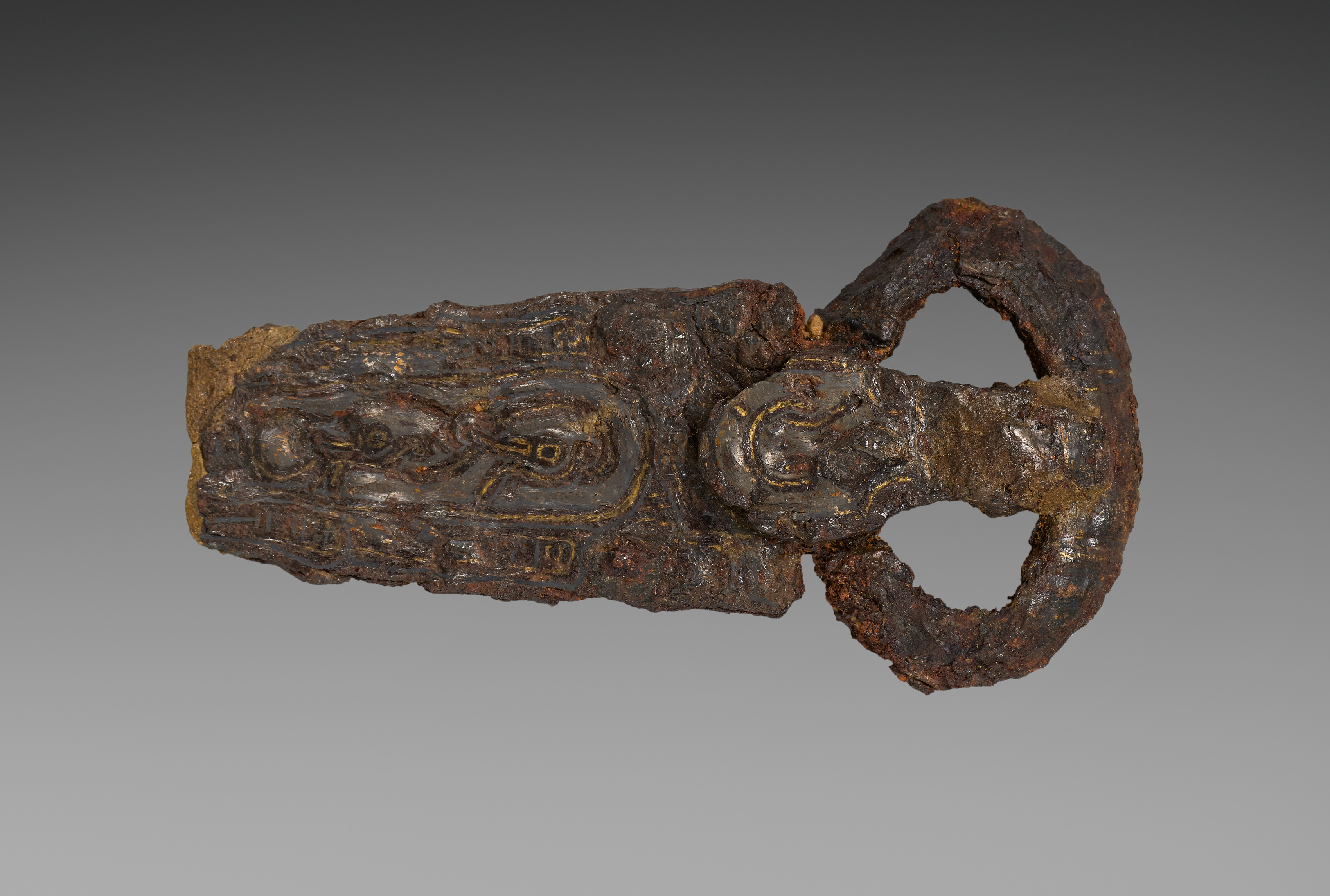 The object is a buckle, specifically a tongue, loop, and clasp type. The buckle is made of metal, likely bronze or copper, and has a dark brown patina with visible signs of wear and tear. It features a rectangular plate with a raised design on its surface. The design appears to be a stylized pattern, possibly floral or geometric. The buckle has a tongue or prong on one end and a loop on the other, which is likely where the strap or belt would attach. The buckle's surface is rough and corroded, suggesting age and use. The background of the image is a gradient gray, which helps to highlight the details of the buckle. The artist of the buckle is not visually identifiable from the image. The buckle is presented against a plain background, with no other objects or context provided.