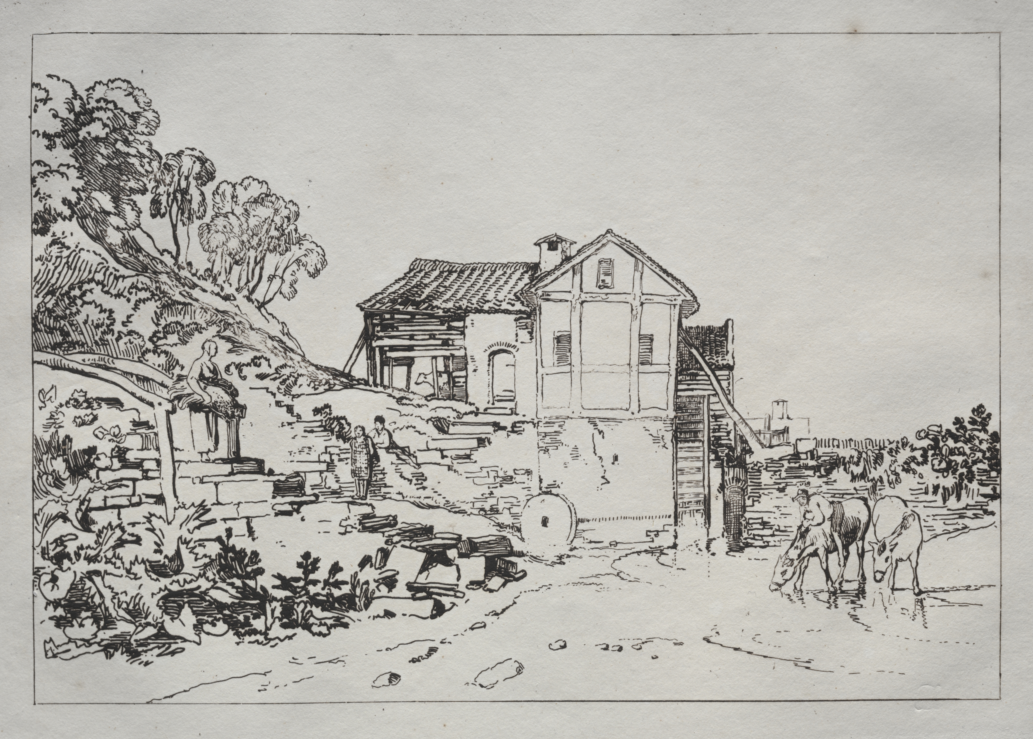 Black and white drawing of a building, a watermill, on a hillside. The building is two stories with a tiled roof and a chute leading to a water wheel on the right side. A horse and a donkey are on the right side. A man and a woman are standing on stone steps on the left side. A woman sits on a pillar on the left. Trees on a hill are on the left. The sky is blank.