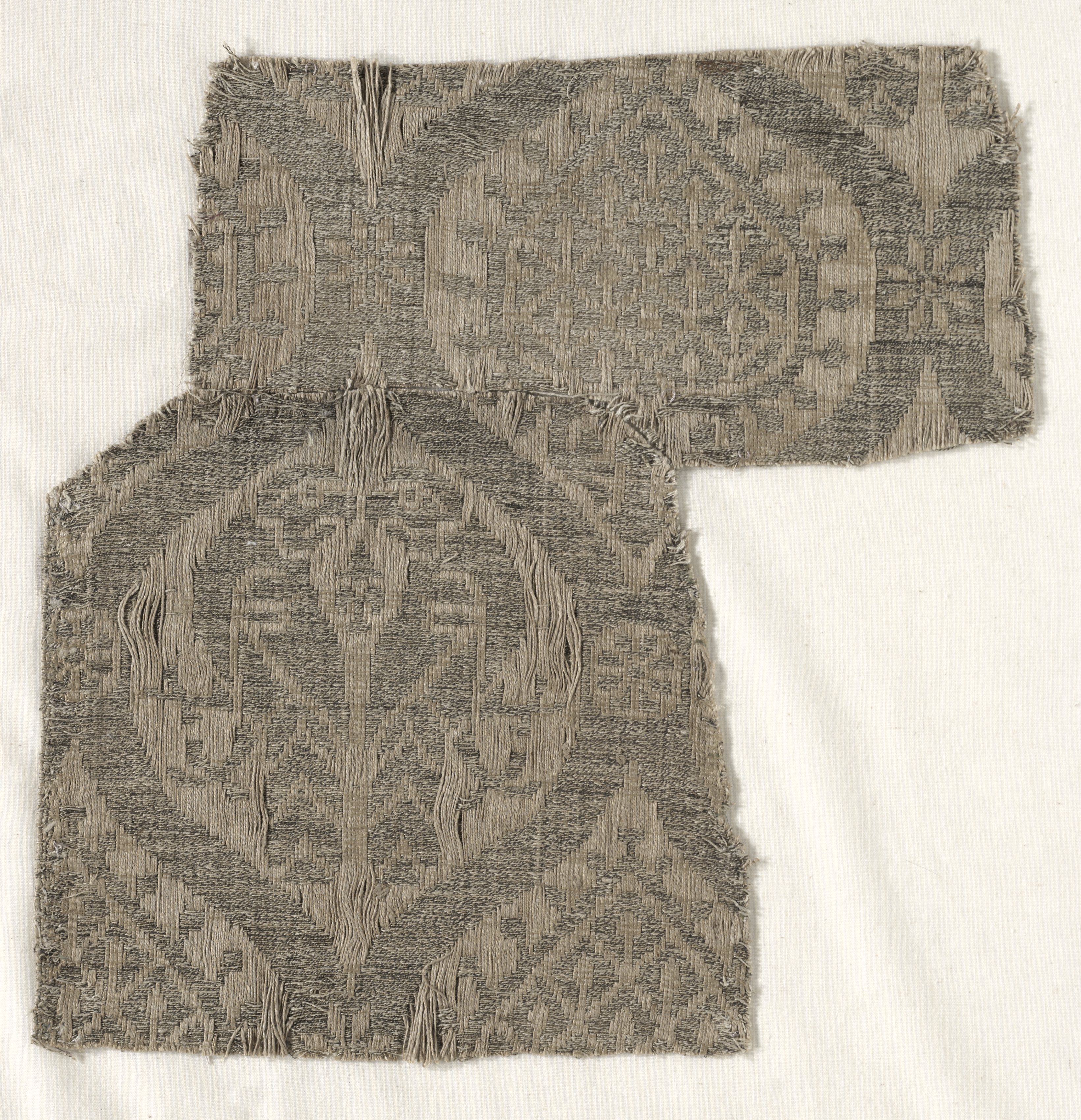 The image shows two pieces of fabric, one positioned on top of the other, resembling an L-shape. The larger piece is on the bottom left; the smaller piece on top is on the upper right. Both pieces display a woven pattern in shades of light brown and gray. The fabric appears to be old and frayed around the edges. The background is off-white fabric. The title of the work is "Textile Fragments".