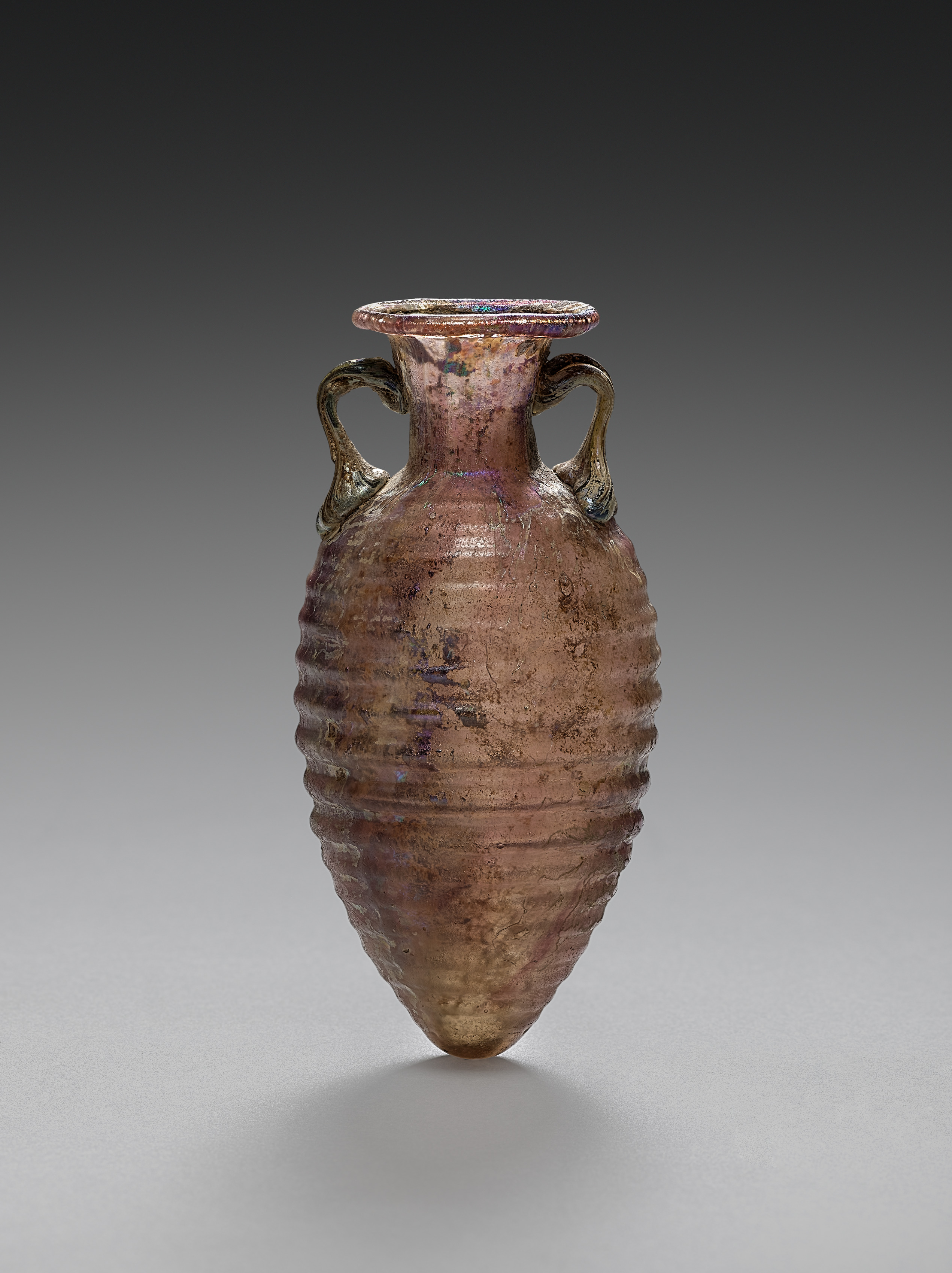 The Amphoriskos (Small Amphora) by the Metropolitan Museum of Art is a glass vessel with a narrow body and rounded base. The body features horizontal ridges and a narrow neck with a flared mouth. It has two small loop handles on either side. The vessel is primarily shades of brown and pink with a slight sheen and some iridescence on the rim. The background is a gradient from dark gray at the top to light gray at the bottom.