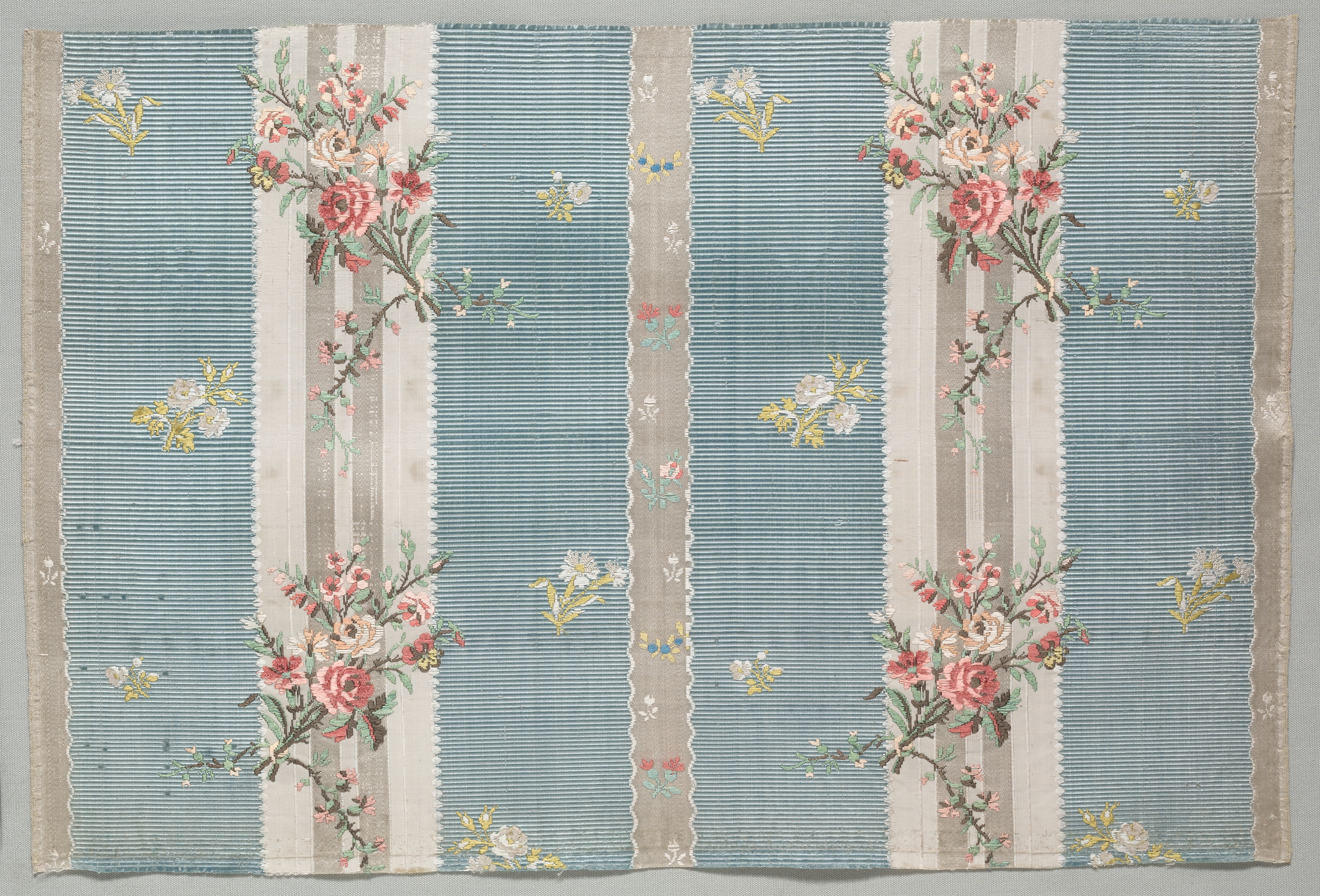 Taffeta Fragment by artist unknown. The image shows a piece of fabric with a repeating design. The fabric is rectangular and has a light blue background with thin, horizontal stripes. There are vertical stripes of different widths running through the fabric, some with a solid beige color and others with a floral pattern. The floral pattern features pink roses and white flowers with green leaves. The fabric has a beige border on all sides with some white residue or staining. The image does not show the entire piece of fabric, as it appears to be a fragment.