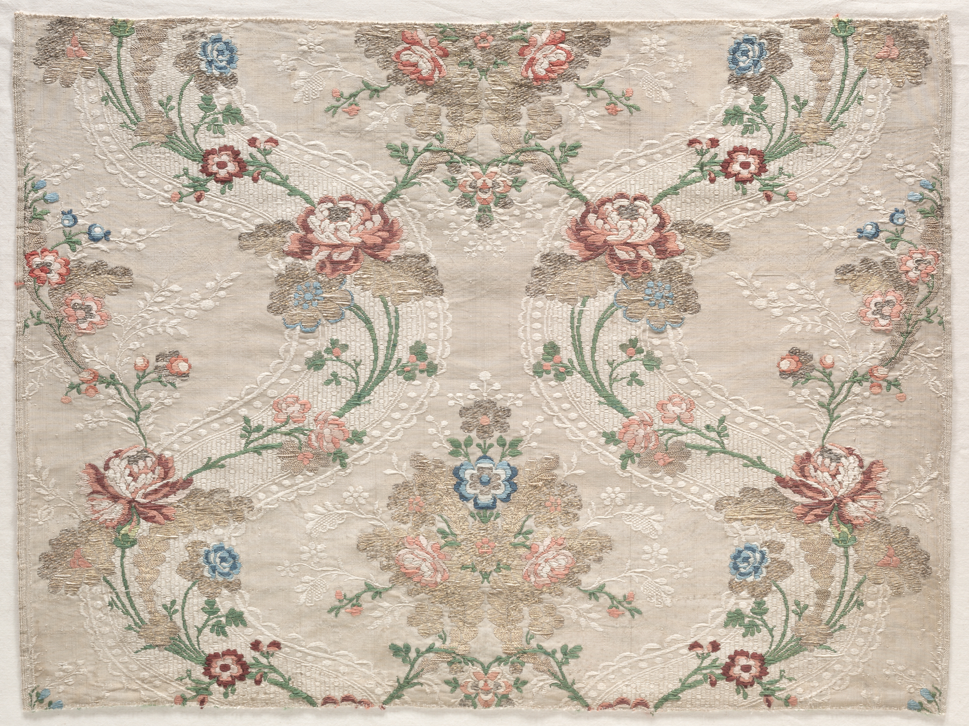 Taffeta Fragment by artist unknown. The image shows a square piece of fabric with a floral pattern. The fabric is beige with a floral design in shades of pink, blue, red, and green. The flowers are embroidered in a repeating pattern with green stems. The fabric has a textured, woven appearance with a subtle sheen. The edges of the fabric are rough and frayed. The background behind the fabric is white. The fabric appears to be an antique or vintage piece, possibly from the 18th or 19th century. The embroidery is intricate and detailed, with curved lines. The fabric is likely made of silk or another luxurious material. The overall design is symmetrical, with a central motif repeated throughout.