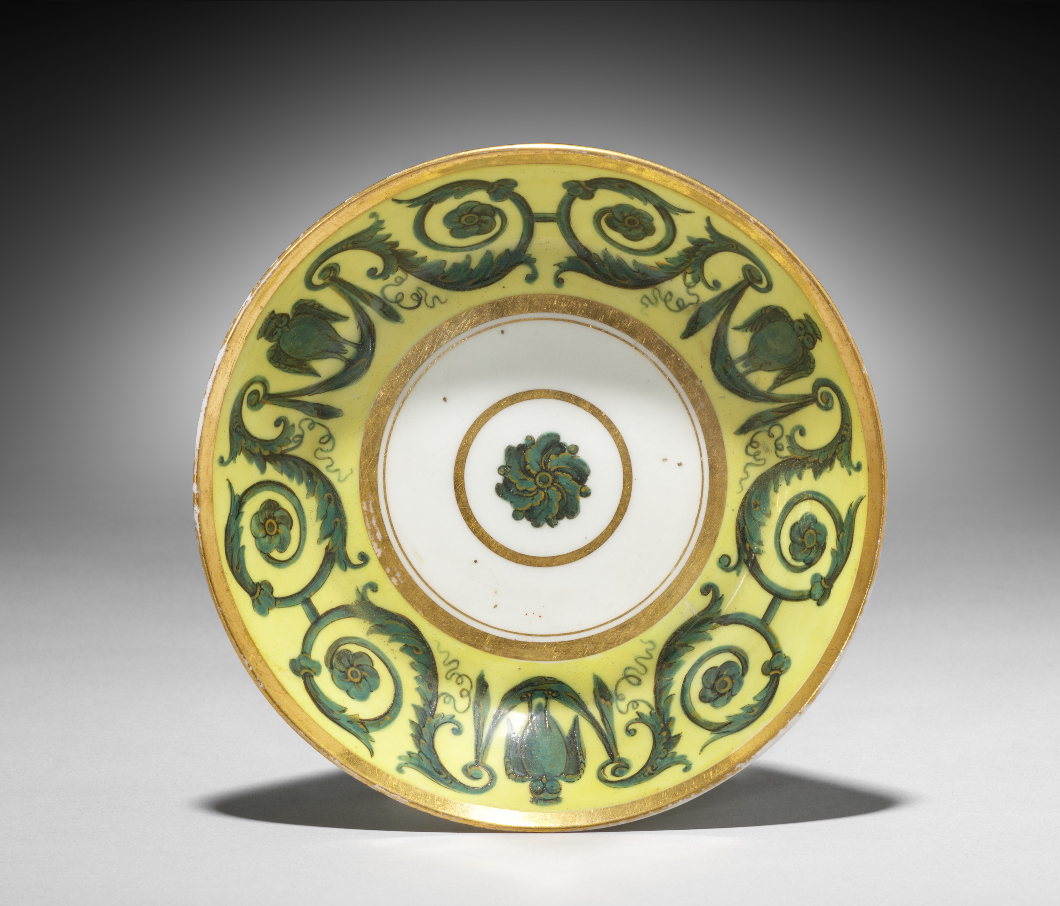 Round saucer with a white center and yellow rim. The center has a gold circle around a green floral design. The rim is decorated with a repeating green floral pattern with gold accents. The background of the image is a gradient from black to white. The saucer is sitting on a white surface and has a shadow underneath it.