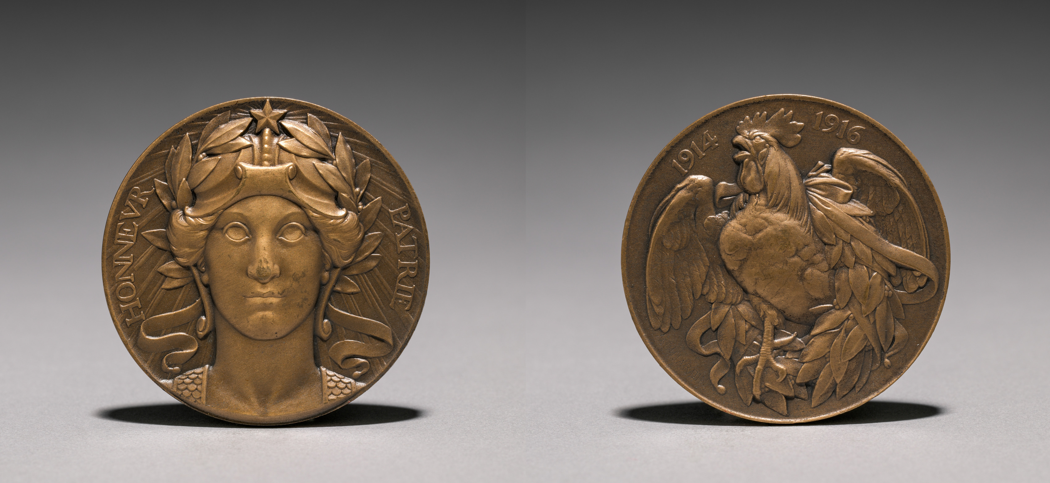 Medal by Auguste Dujardin. Two bronze-colored medals. The medal on the left: a woman's head facing forward with a star on her head and leaves on her hair and the words 'HONNEUR ET PATRIE' on either side. The medal on the right: a bird with spread wings. The years '1914 '15 '16' are on the top.