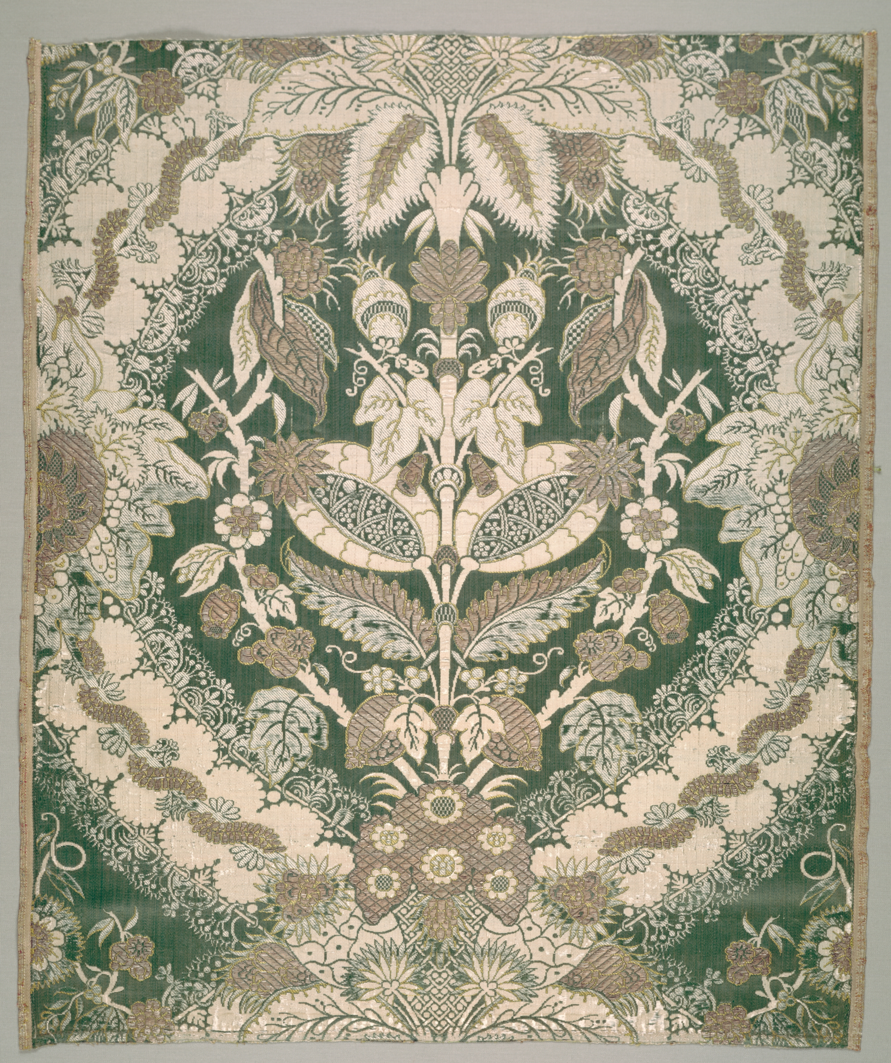 The Textile Fragment by Morris and Co. features a dark green background with a beige and brown floral pattern. The design includes various types of leaves, flowers, birds, and acorns. A central stem with leaves and flowers extends from the bottom to the top, with symmetrical patterns on either side. The edges of the textile have a beige border. The colors used are dark green, beige, and shades of brown. The overall design is intricate and symmetrical, with a mix of natural elements. The textile appears to be a woven fabric, possibly a tapestry or a piece of decorative cloth.