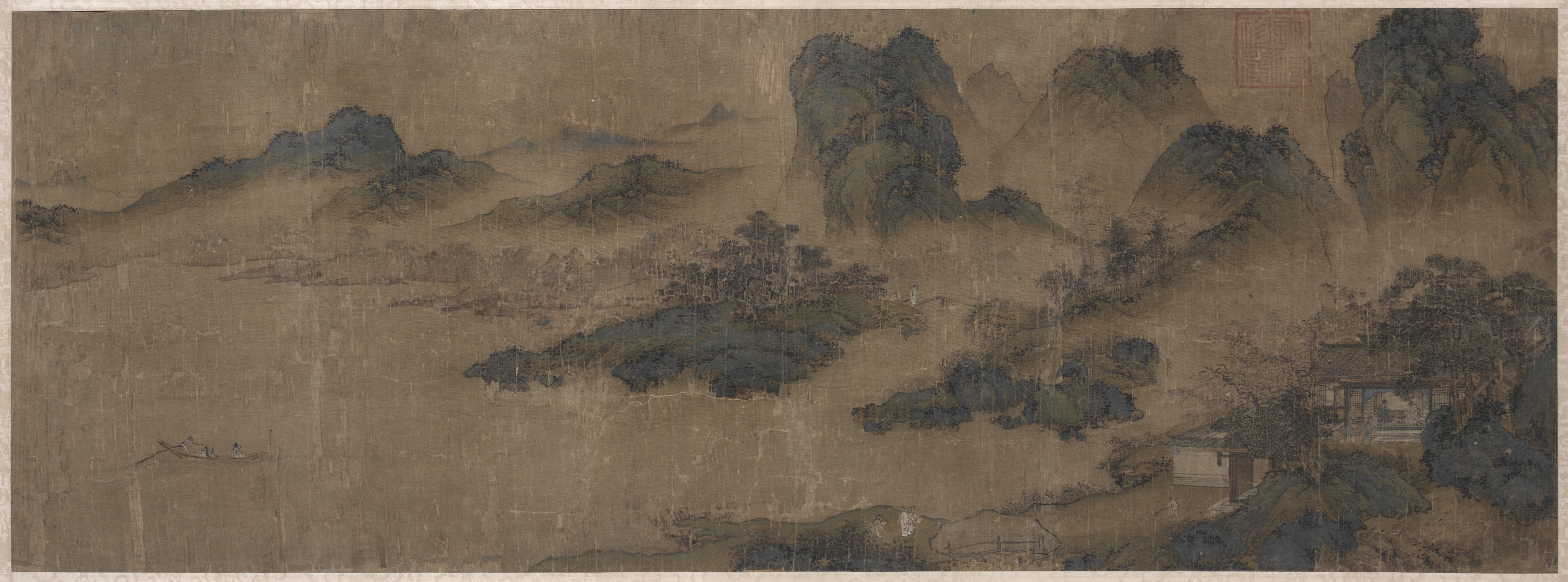 A landscape painting on a long, horizontal scroll. The painting depicts mountains, trees, and a body of water. In the foreground, there are trees and bushes on the right side, with a small building. On the left side, there are two people in a boat on the water. The background has rolling hills and mountains with mist. The painting colors are muted, with shades of brown, green, and gray. The painting appears to be old and worn, with visible signs of aging on the surface.