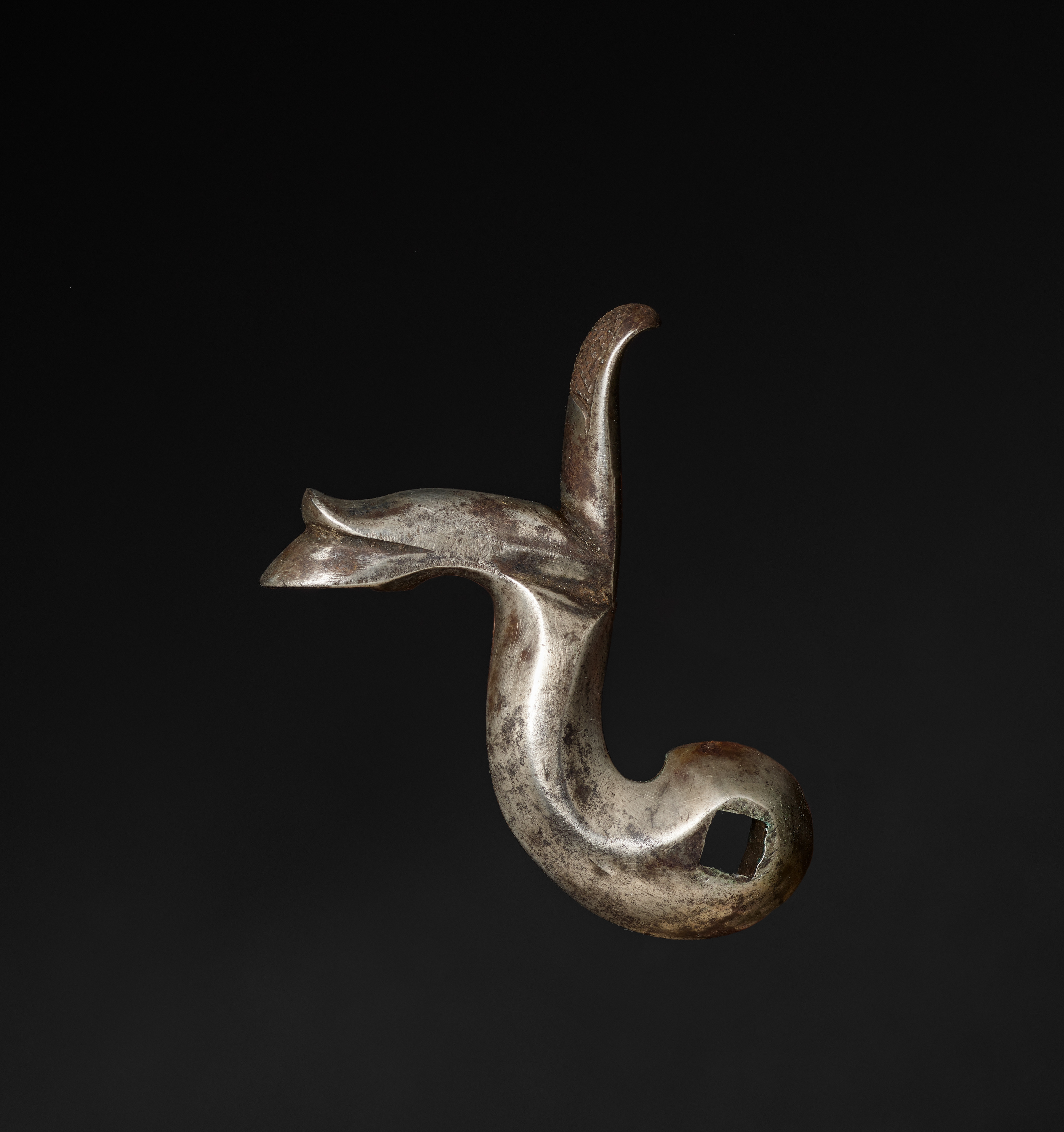 Gun-Lock Hammer. Metal object with a curved top and a hook-like bottom, resembling a hammer or a hook. The object is made of metal with a grayish-brown color and visible signs of wear and tear. The curved top is thinner and tapers to a point. The hook-like bottom is thicker and has a rounded end. The object has a rough texture and appears to be old. It is positioned on a black background. The object is shaped like a backwards "J". The surface of the object shows signs of aging, with darker spots and discoloration. The object appears to be a single piece with no visible attachments or separate parts. The background is solid black with no other objects or features.
