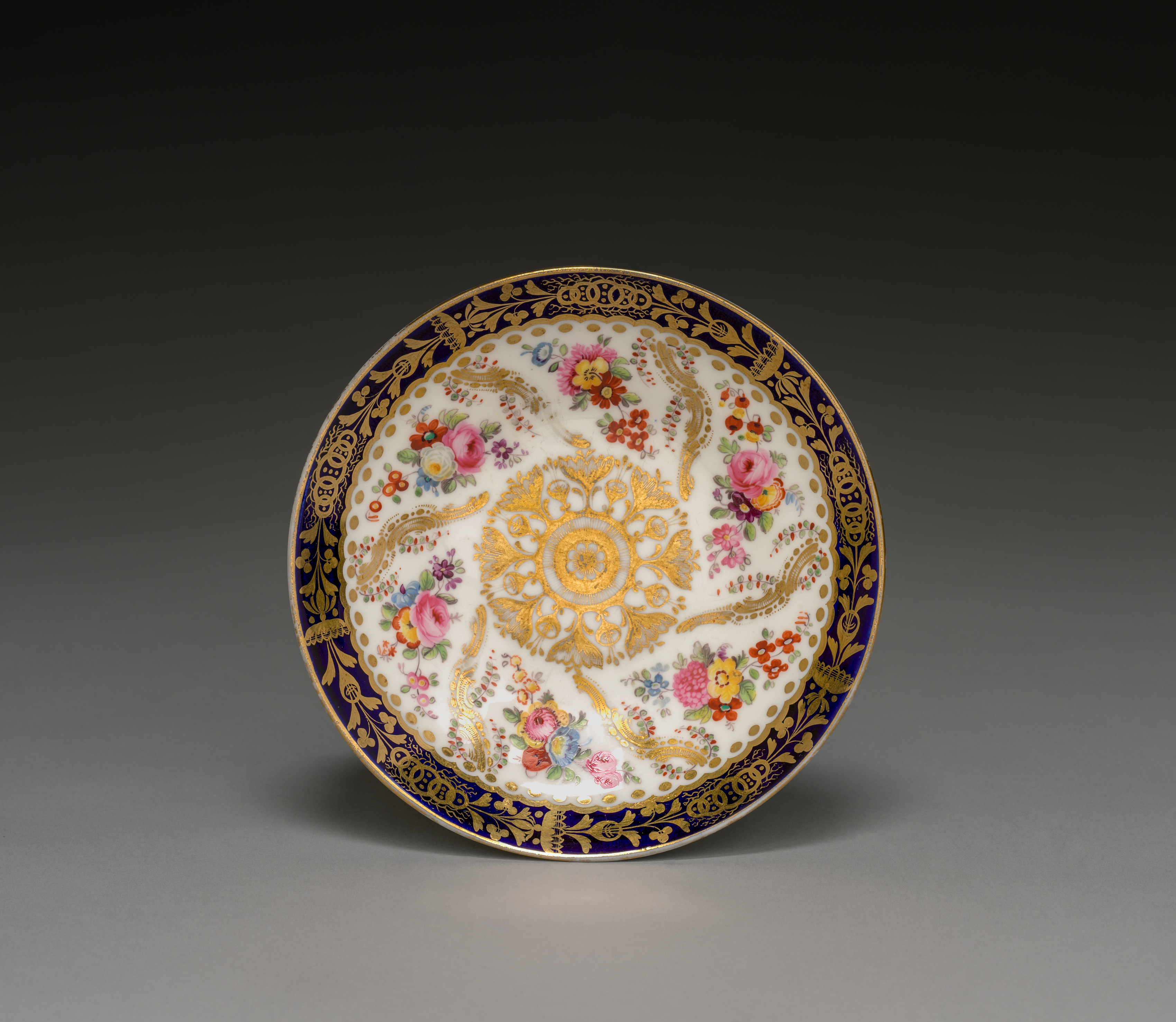 The saucer is white with colorful floral designs and gold accents. The rim has a blue and gold pattern. The saucer has a gold floral design in the center. The saucer's rim is decorated with a blue band featuring a gold floral pattern. The saucer features pink, red, blue, and yellow flowers. The background of the image is dark gray.