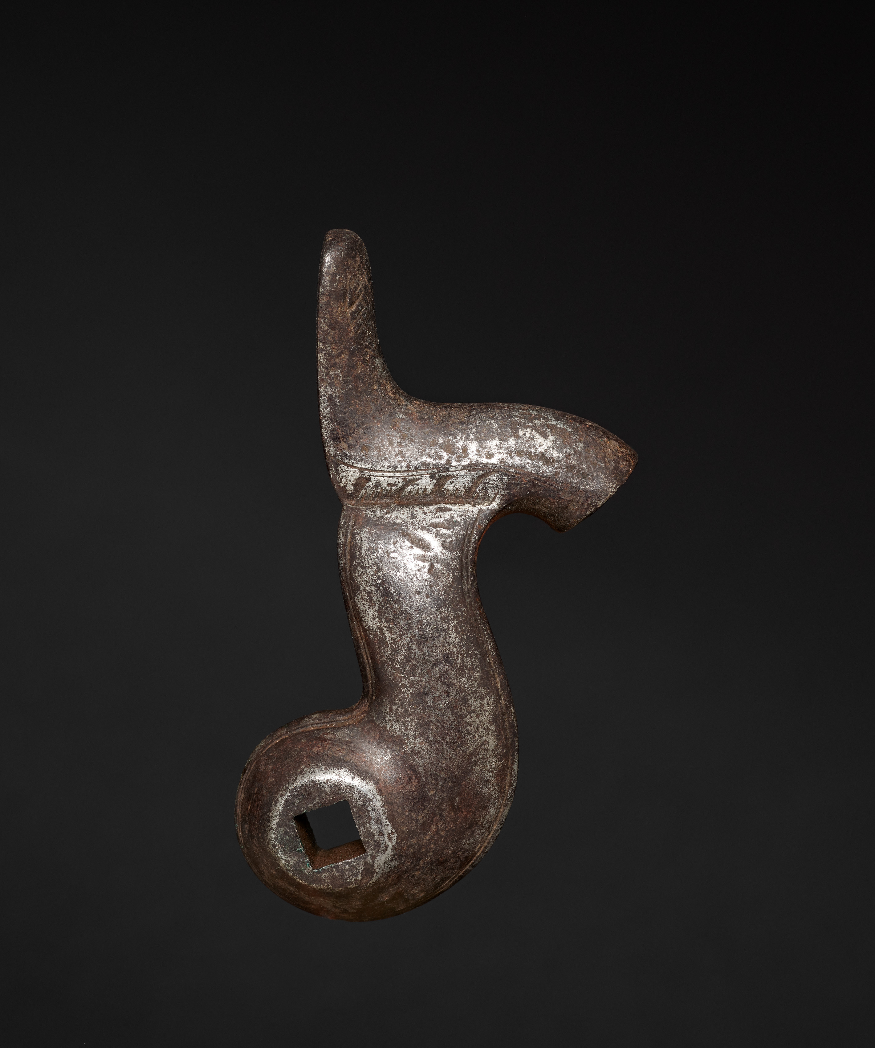 Metal object, Gun-Lock Hammer, with a dark brown and gray color. The object is shaped like a hammer with a curved end. It has a hole with a square-shaped opening at the bottom. The surface appears worn and rusty. The background is black.