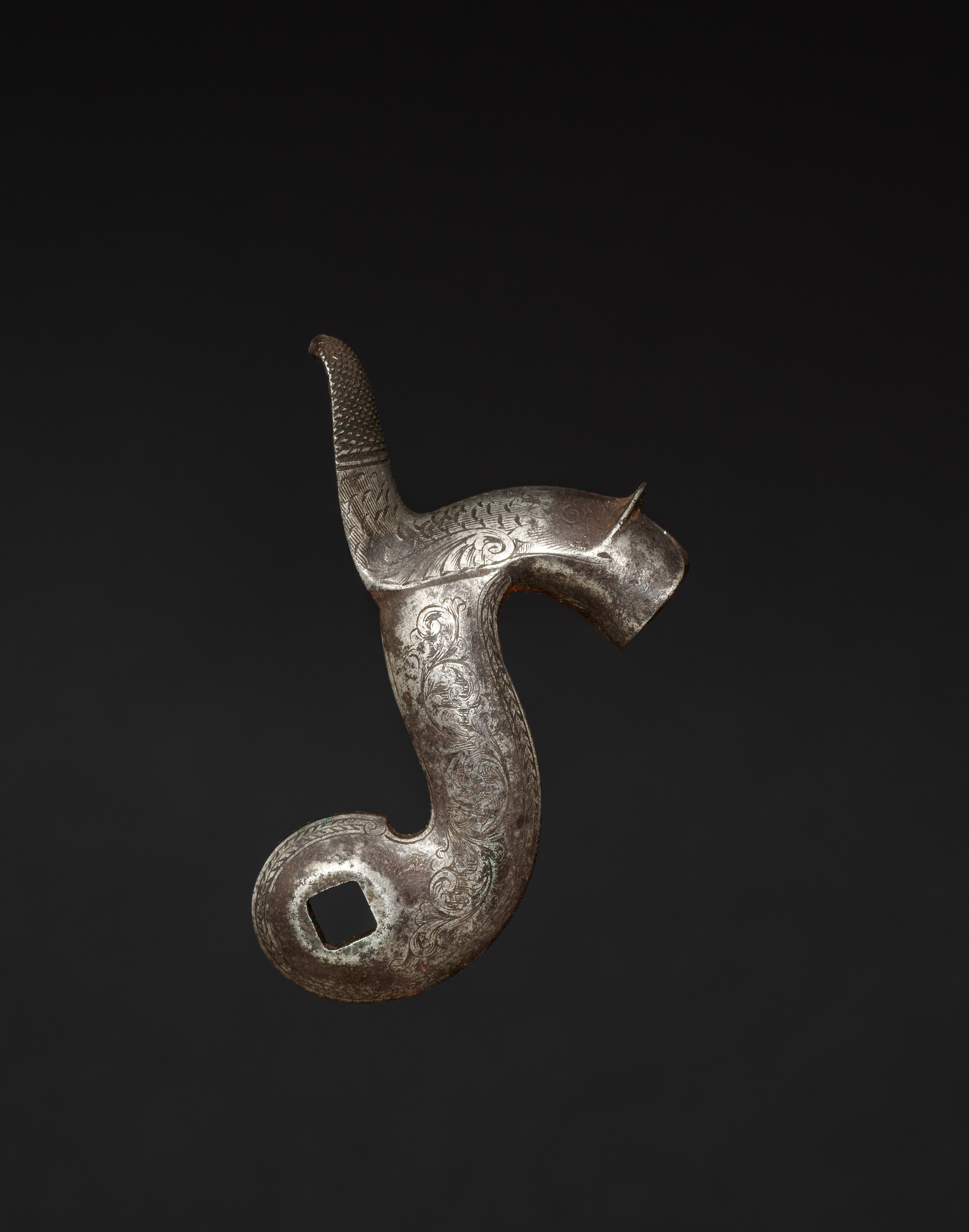 The image shows a gun-lock hammer by artist. The hammer is made of metal and has a curved, elongated shape. The hammer has a long, thin tail with a textured surface at the end. The main body of the hammer is thick and curved, with an etched design. The etched design on the hammer appears to be floral or scroll-like patterns. The hammer has a hole at the bottom, which is circular in shape. The background of the image is black. The hammer appears to be old and worn.