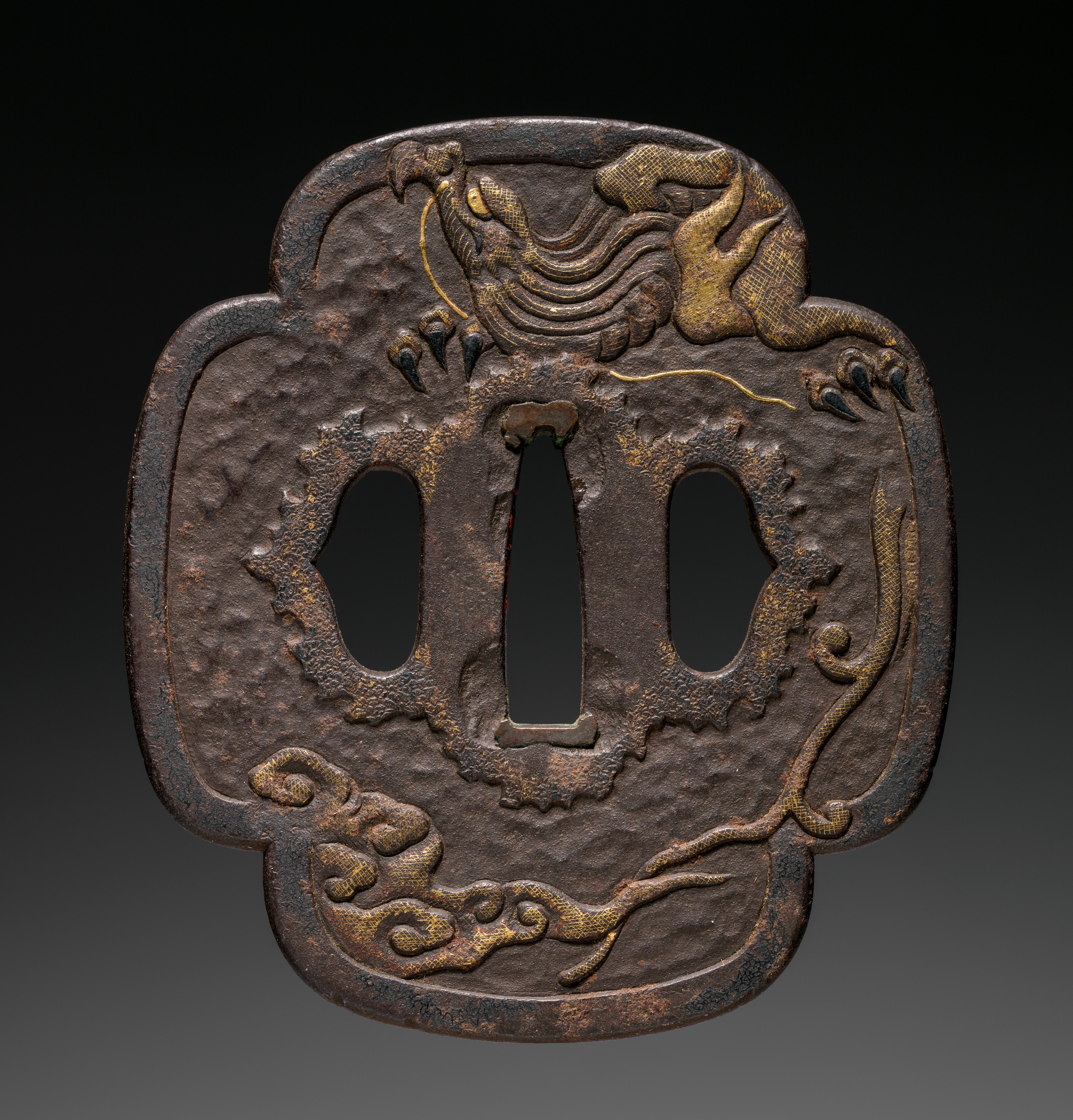 Dark brown metal object with a rectangular shape and rounded edges. Two oblong cut-outs on either side of a central elongated cut-out. Decorated with a gold-colored dragon on top surrounded by wavy lines, resembling a stormy sea. The dragon's body winds around the bottom and right side of the object. The metal appears weathered with a rough texture and visible signs of aging. The background is a gradient from black at the top to gray at the bottom.