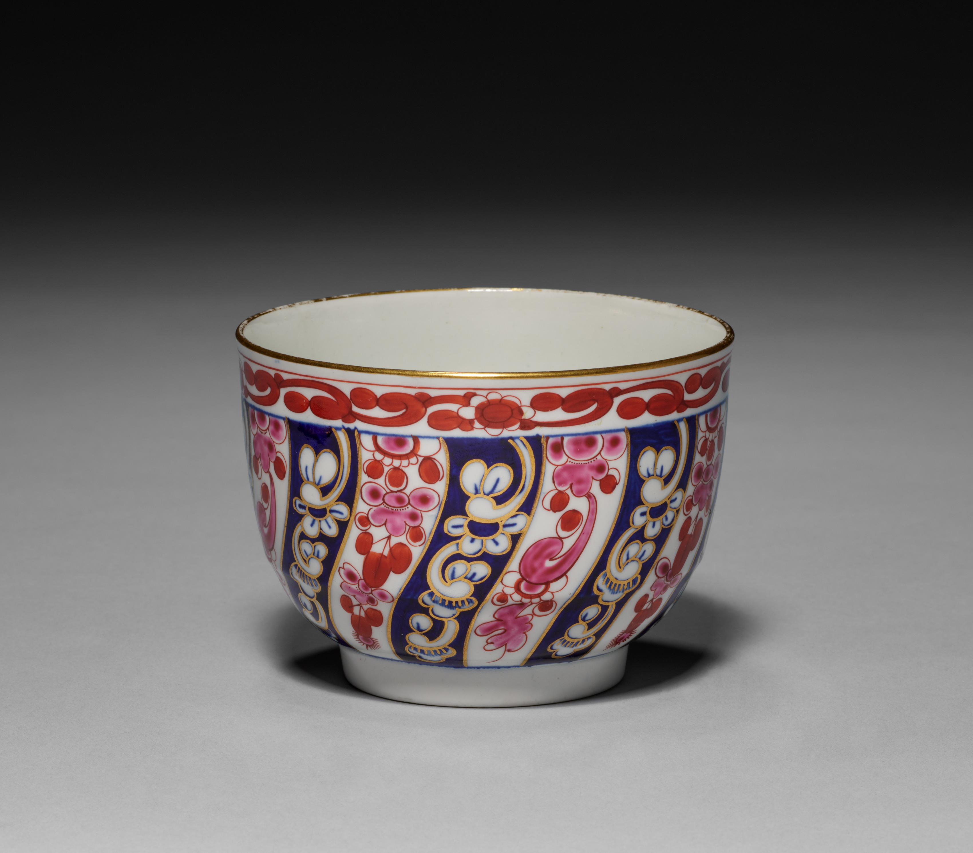 Bowl by Worcester Porcelain Factory. White ceramic bowl with rounded body and short foot. The bowl has a wide mouth and a small base. The exterior features a colorful floral pattern with red, pink, blue and gold designs on a white background. The rim of the bowl has a thin gold border. The interior of the bowl is white with a thin gold rim. The background of the image is gray with a darker gradient at the top. The bowl casts a small shadow on the surface below it.