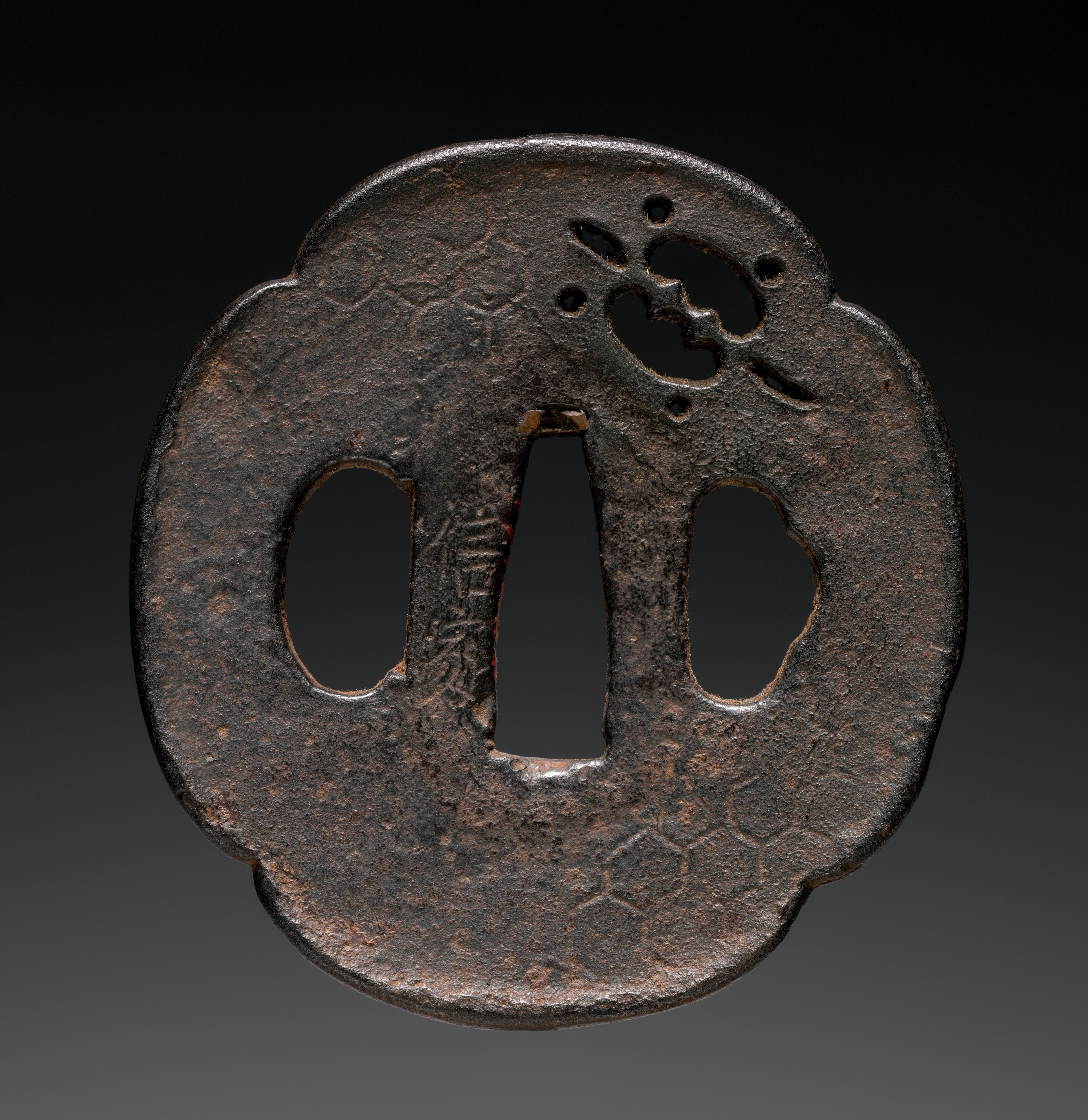 Dark brown metal object, rounded with a wavy edge, featuring two large oval-shaped holes side by side in the center and a cluster of small and medium-sized holes at the top. The surface exhibits a textured appearance with a subtle pattern resembling hexagons. The object is a Sword Guard by artist unknown.