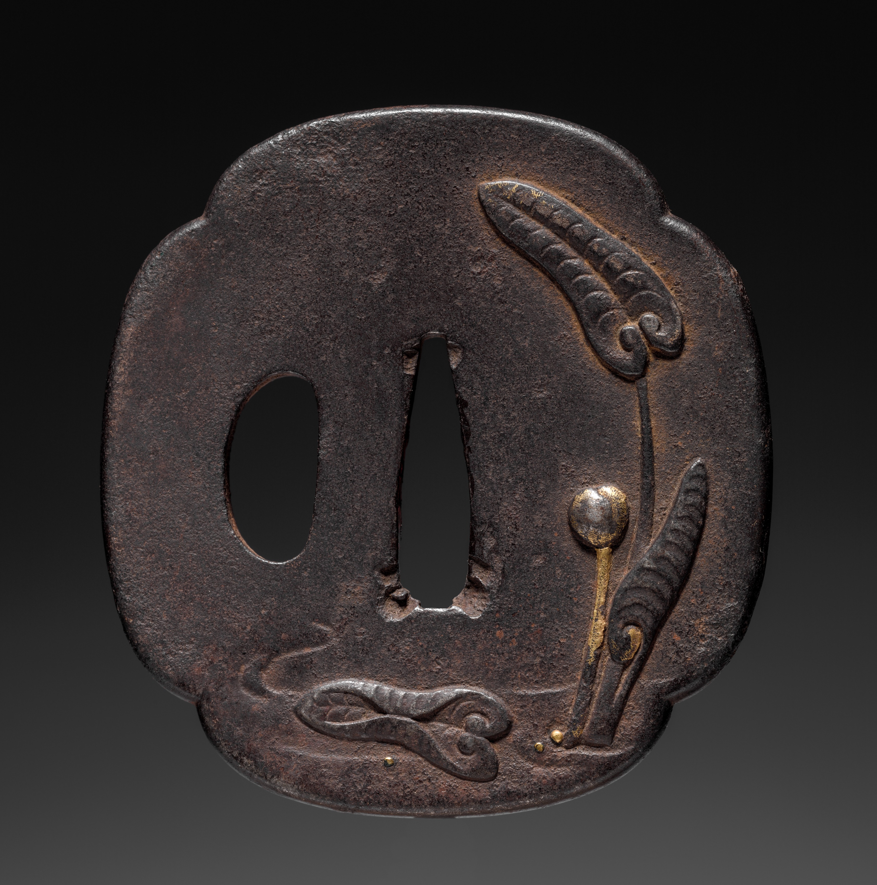 Dark brown metal sword guard with rounded shape and scalloped edges. Two central holes, one oval on left and one elongated on right. Decorations on right feature a stem with a spherical ornament and two long leaves or feathers; a wavy line on bottom left resembling a snake or vine. Metal surface textured with visible signs of aging and wear. Background is dark, transitioning from black to gray. Title: Sword Guard (Tsuba).