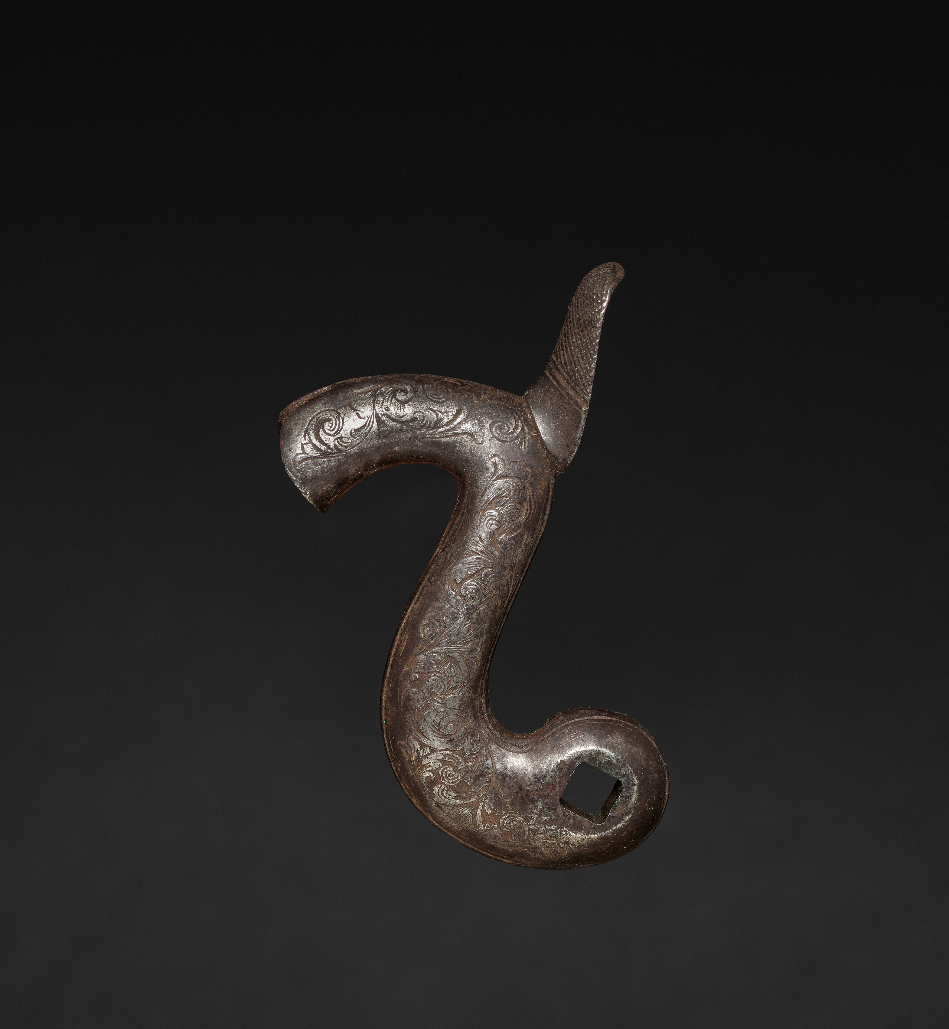 Gun-Lock Hammer by artist. The gun-lock hammer is made of dark brown metal with a worn appearance. It has an etched floral design on its surface. The hammer has a curved shape with a small square hole at the end of the curved section. A protrusion extends from the top of the curved section. The background is dark gray, transitioning to black. The object is centered in the image.