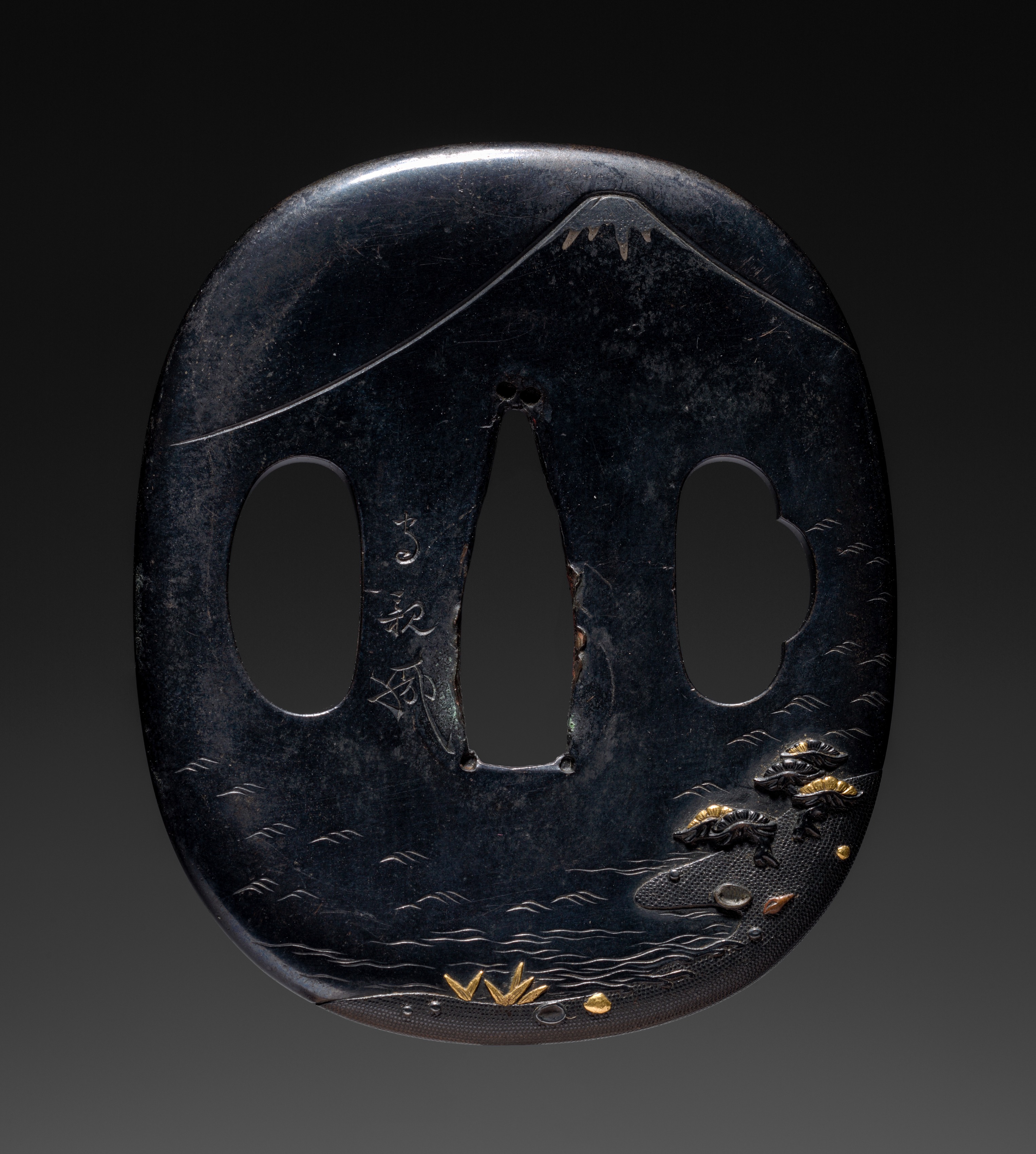 The image depicts a circular, dark gray metal object with rounded edges. The object features three oval-shaped holes in the center. A mountain shape is engraved on the top. The lower portion of the object showcases an etched design of water and plants, adorned with gold accents. A signature appears on the left side near the center. The object titled, Sword Guard (Tsuba) with Mt. Fuji, is by an unknown artist.