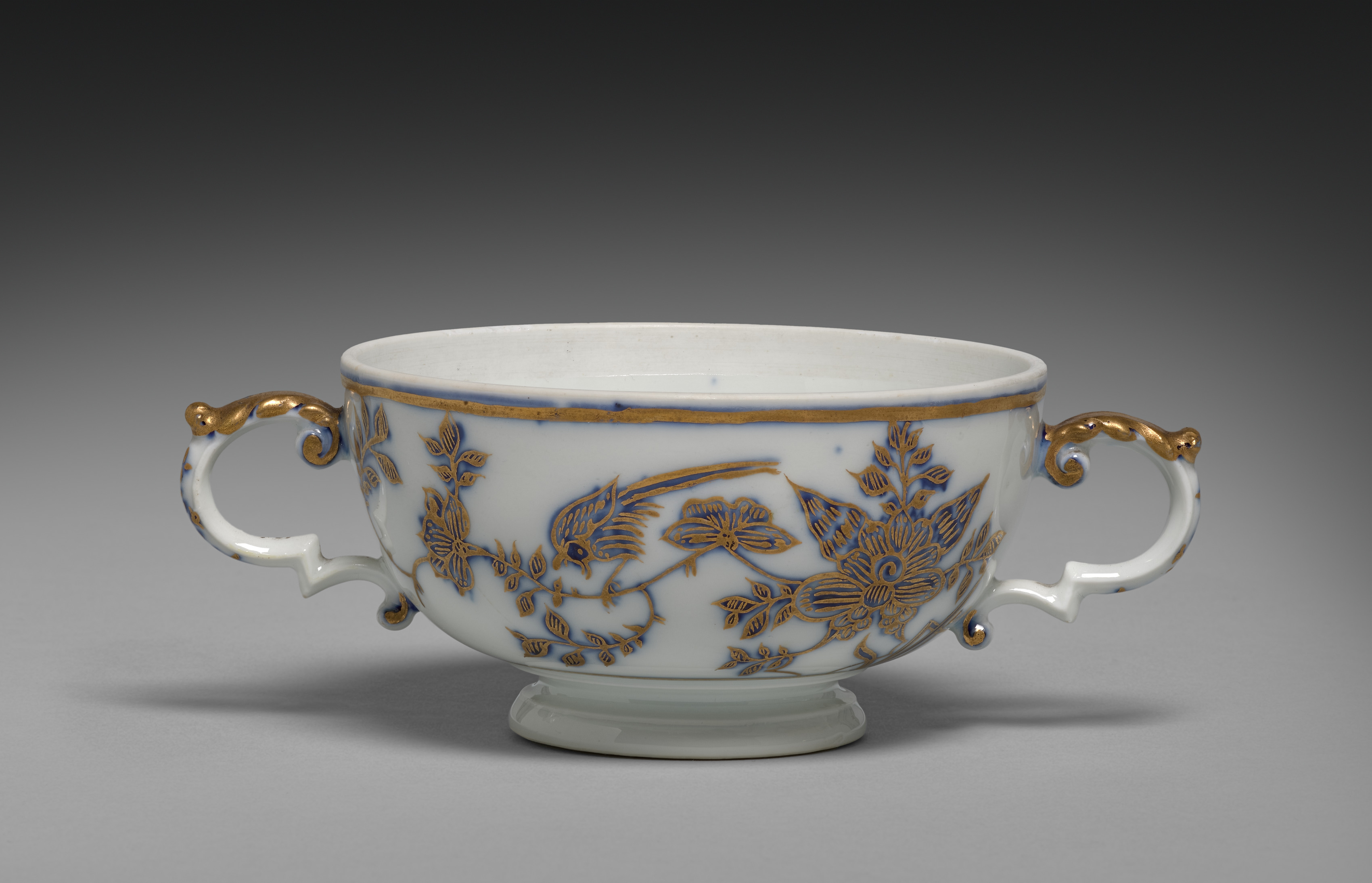 White porcelain bowl with two handles, one on each side. The handles are white with gold accents. The bowl has a gold and blue line around the top edge. The body of the bowl has a blue and gold floral design on a white background. The bowl has a short pedestal base.