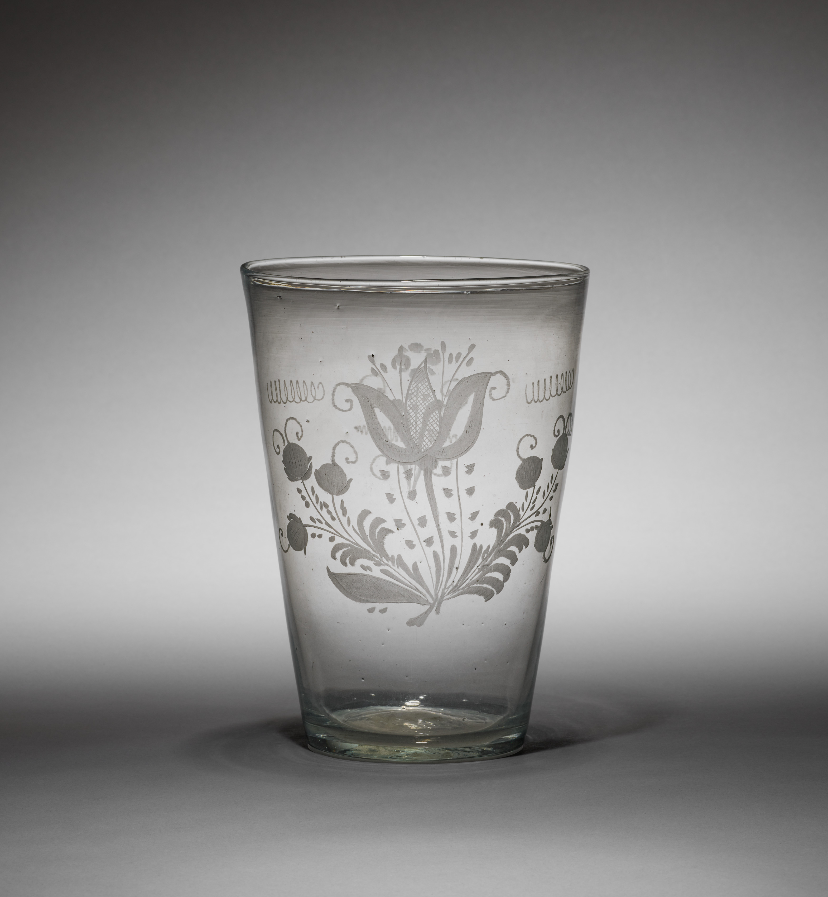Clear glass tumbler with straight sides and flat rim. The glass features an etched floral design in the center, with a large flower at the top and leaves extending down. Two curved lines of small ovals are on either side of the flower. The background of the image is gray, with a vignette effect that darkens towards the edges. The glass casts a shadow on the surface below it. The artist of this piece is associated with "Flip Glass".