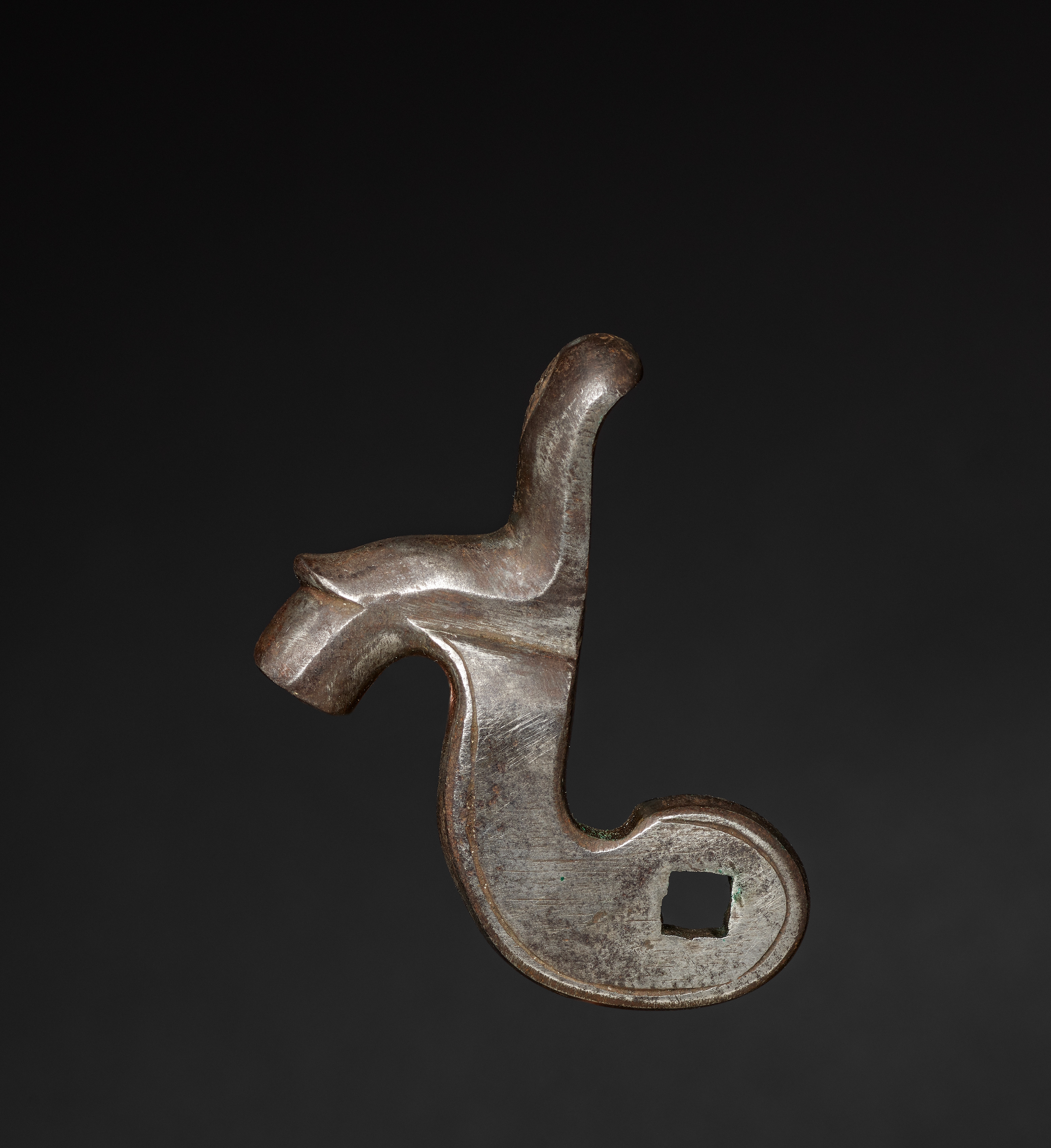 Gun-Lock Hammer by Artist Unknown. The image shows a metal object with a dark background. The object is made of metal and has a curved shape resembling a hammer or a hook. It is positioned with the curved end pointing downwards and to the right. The object has a small square hole at the bottom of the curved end. The metal is weathered with visible signs of wear and tear, and it appears to be an old piece. The background of the image is solid black.