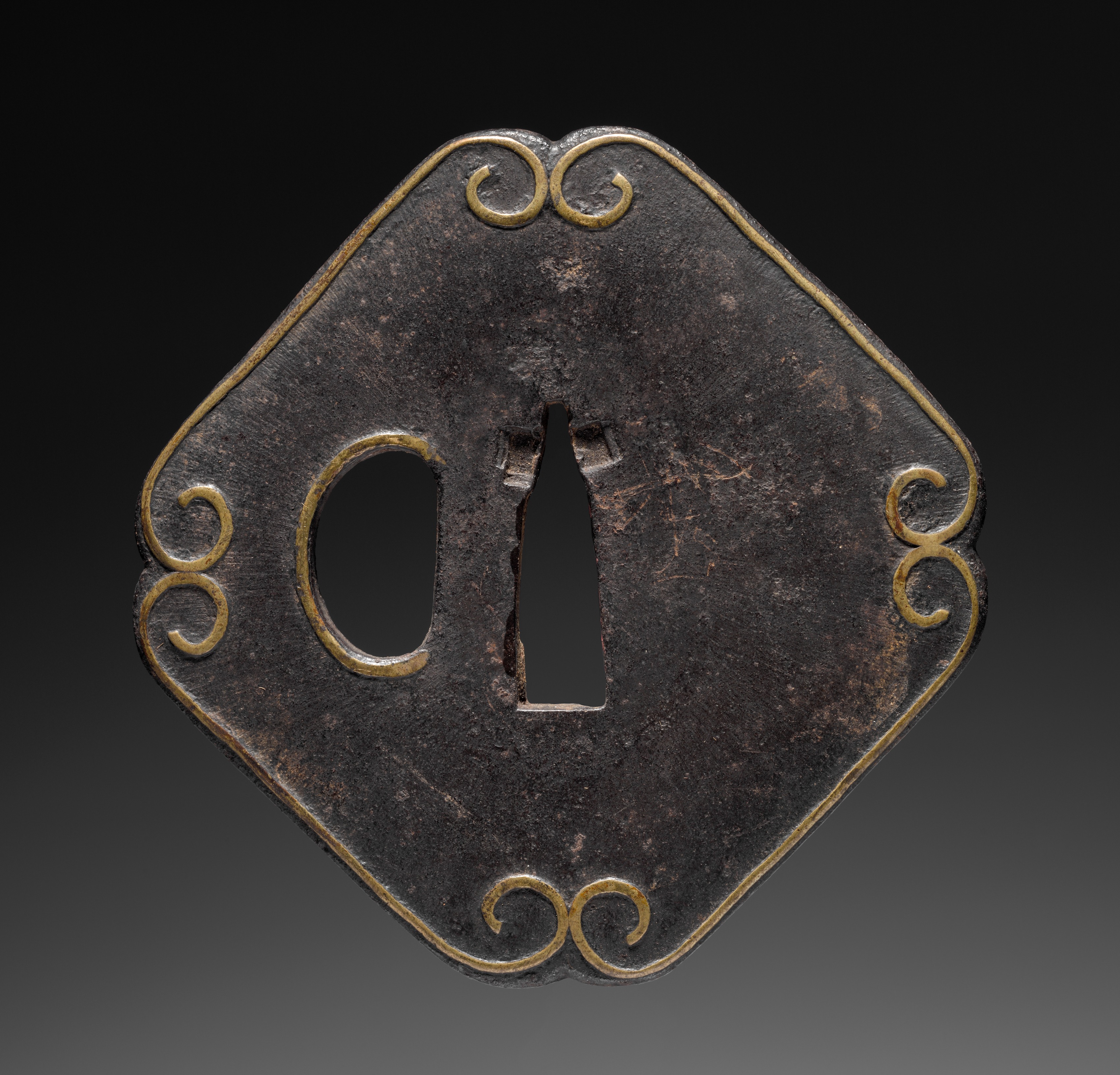 A diamond-shaped sword guard with rounded corners features a dark brown metal body exhibiting a weathered appearance. The guard has a gold-colored border adorned with a scroll design at each corner. Two openings are present: a rounded rectangle on the left and a narrow, elongated rectangle in the center. The background transitions from black at the top to dark gray at the bottom. The title of the piece is "Sword Guard (Tsuba)".