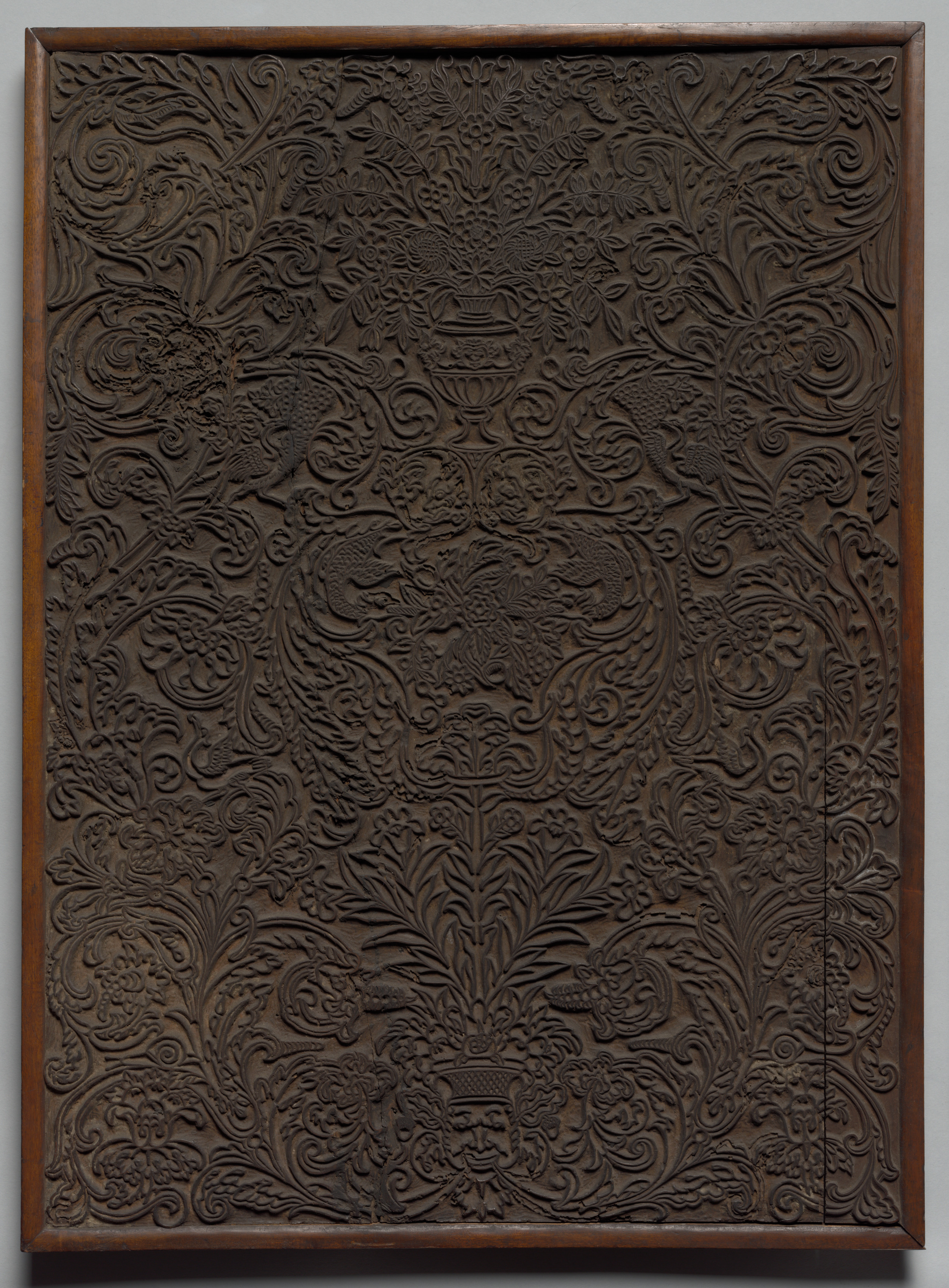 Dark brown panel with raised design; thick wooden frame; intricate floral pattern with leaves, flowers, and birds; birds are scattered throughout; design is symmetrical, divided into quadrants by curved lines; frame has slightly lighter brown color around edges; panel fills most of image. Panel by artist unknown.