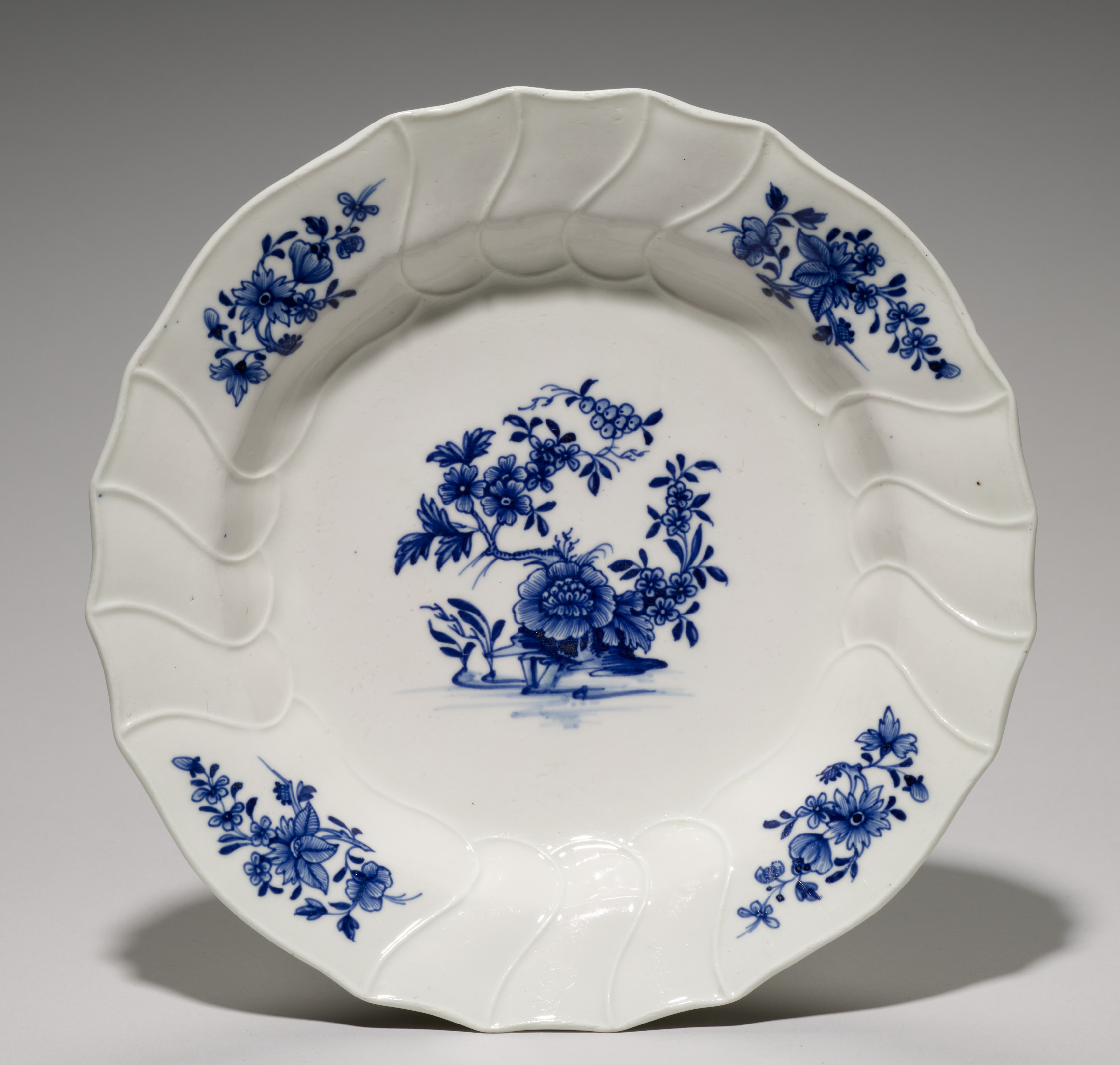 White plate with a blue floral design. Scalloped edge with wavy pattern. Four floral clusters around rim. Central floral design with large flower and curved branch. Background gray gradient. Plate by Tournay Factory.