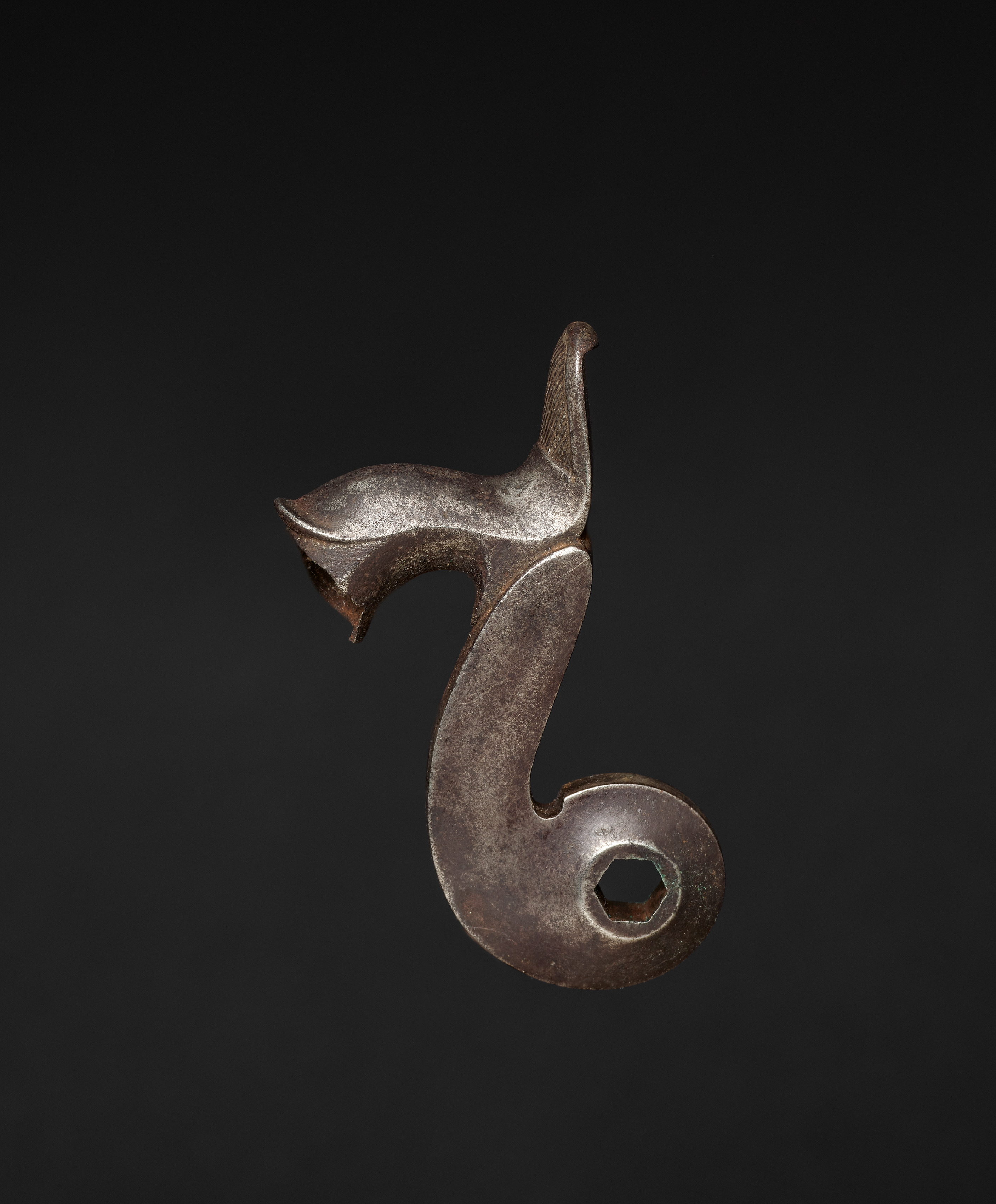 Gun-Lock Hammer by artist Donald Lipski. The image shows a metal object with a dark brown color and a rough texture. The object has a curved shape resembling a hook. The curved part has a hole at the end. A smaller curved piece extends from the top of the hook. The background of the image is black. The object is positioned centrally in the image. The lighting highlights the texture and shape of the object.