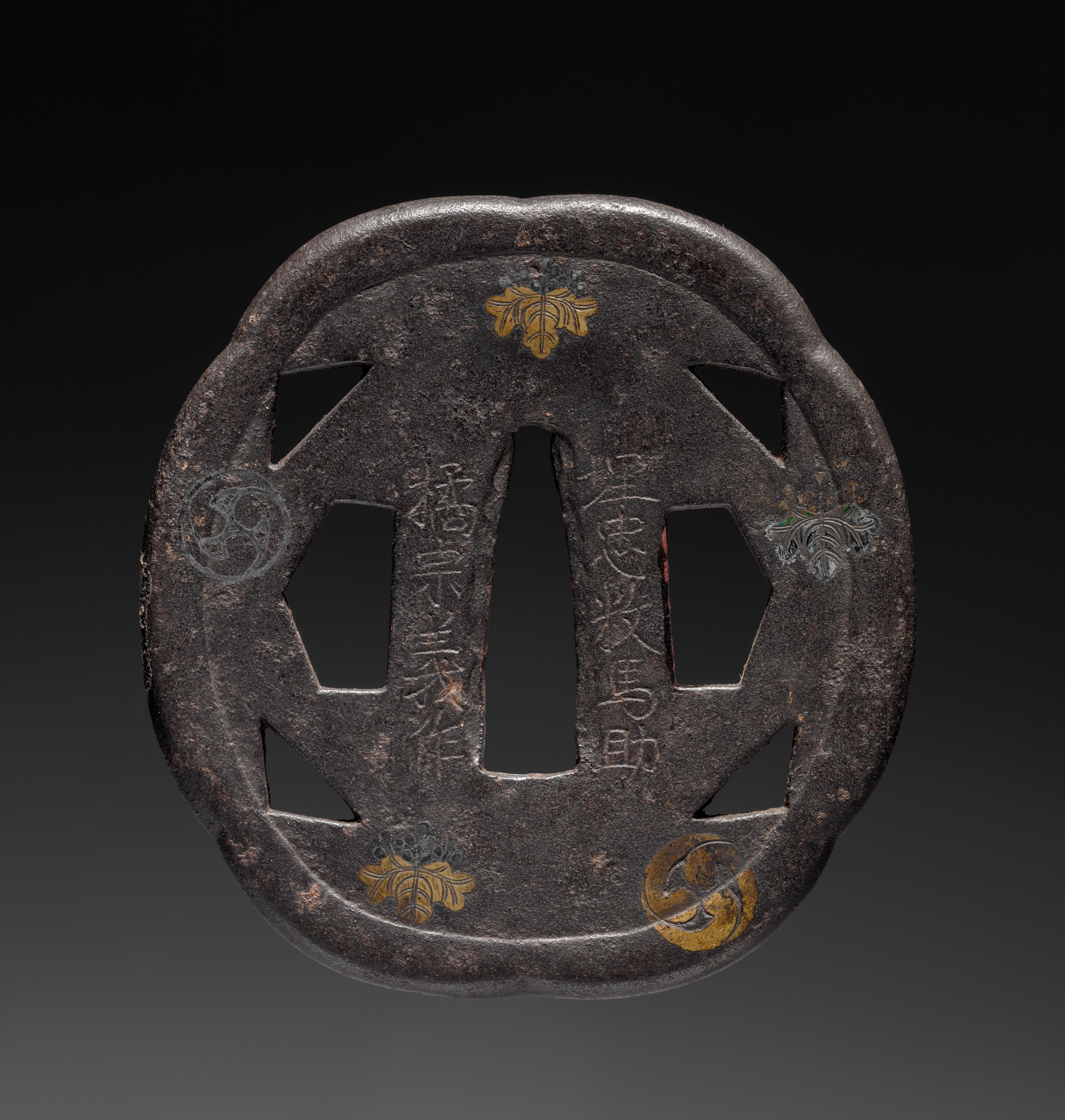 The image shows a circular, dark brown sword guard with a central elongated vertical opening and four cut-out sections on either side. The guard features a raised edge around its circumference. There are several gold and silver inlaid designs on the surface, including what appears to be four family crests: one at the top, one at the bottom, and one on each side. The family crests are rendered in gold and silver. Additionally, there is an inscription in the center of the guard, written in Japanese characters. The background of the image is black, gradually transitioning to dark gray at the bottom.