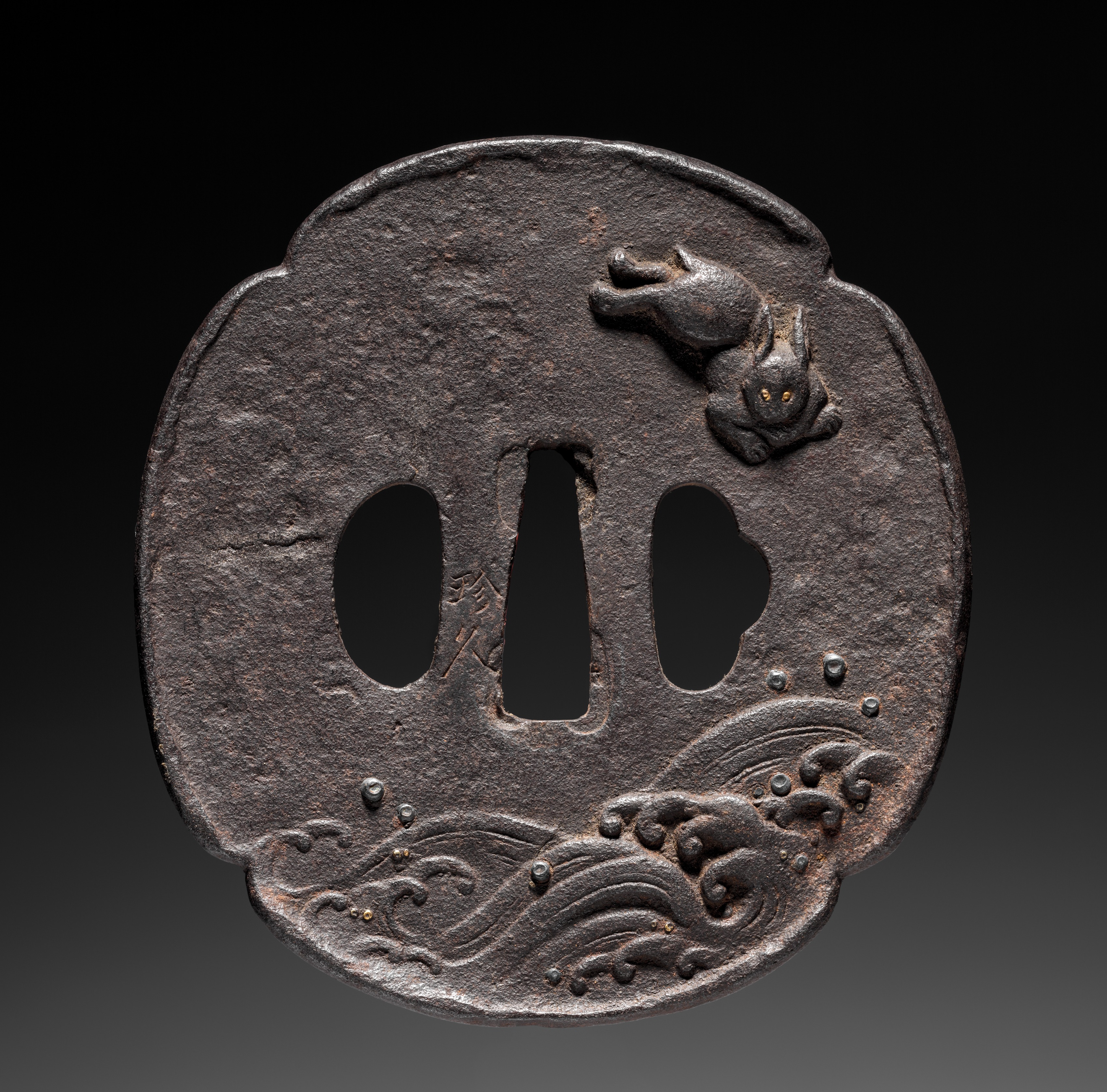 A Japanese sword guard that is round with a wavy lower edge. Three central openings: one long and thin in the centre; one oval on the left; and one oval on the right. The guard features a relief design of a rabbit on the upper right, and a wavy line pattern on the lower edge. The guard appears to be made from a dark metal with a textured surface. The background is dark at the top and fades to light gray at the bottom.