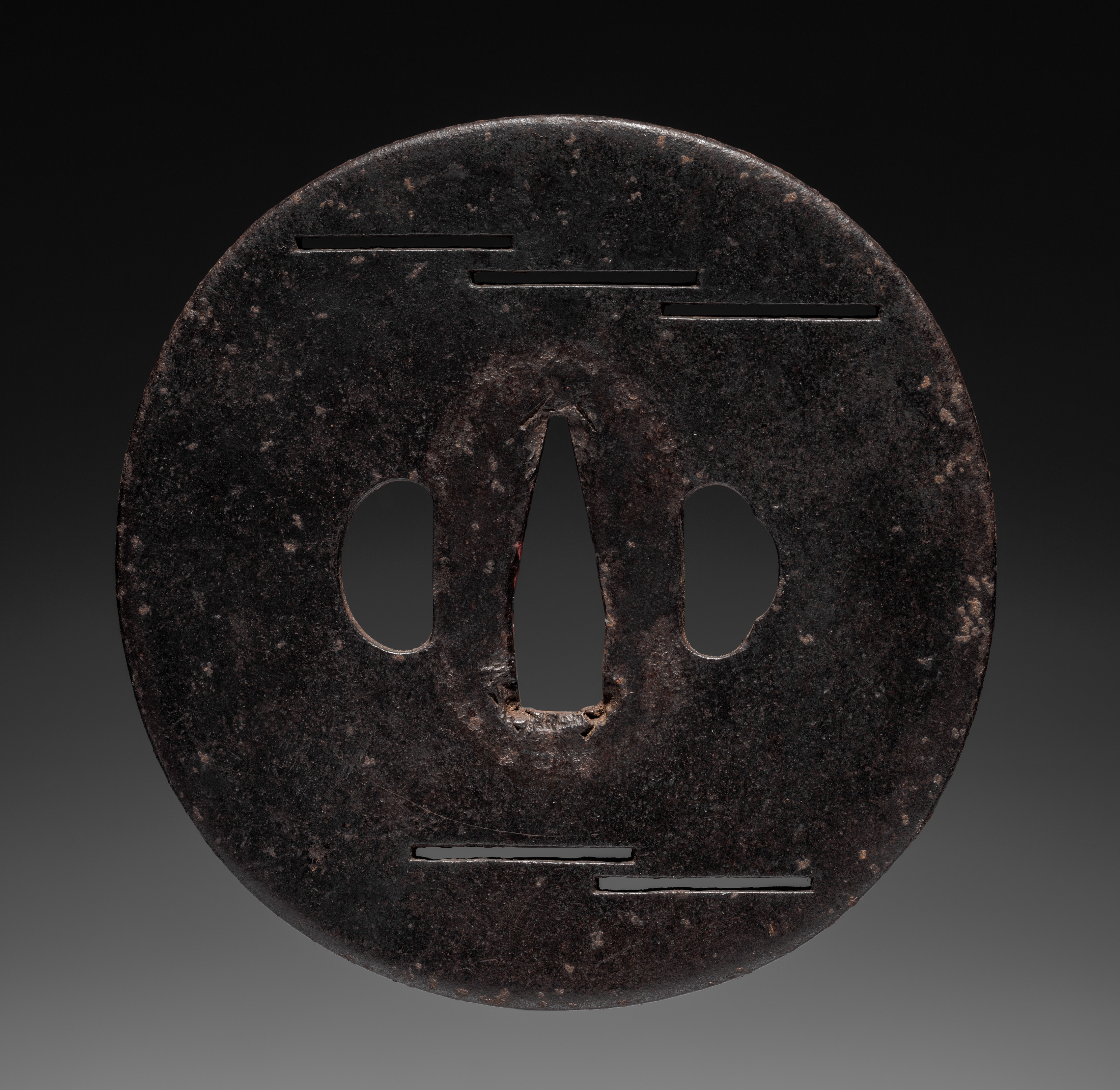 The Sword Guard (Tsuba) is a circular, dark brown metal object with a weathered appearance. The object has a dark brown color with lighter brown spots scattered across its surface. It has a large central hole with a distinctive teardrop shape and two smaller oval-shaped holes on either side. There are two horizontal lines cut into the metal at the top and bottom, and two more on either side of the central teardrop-shaped hole, which appear to be decorative or functional. The background of the image is black at the top and fades to gray at the bottom.