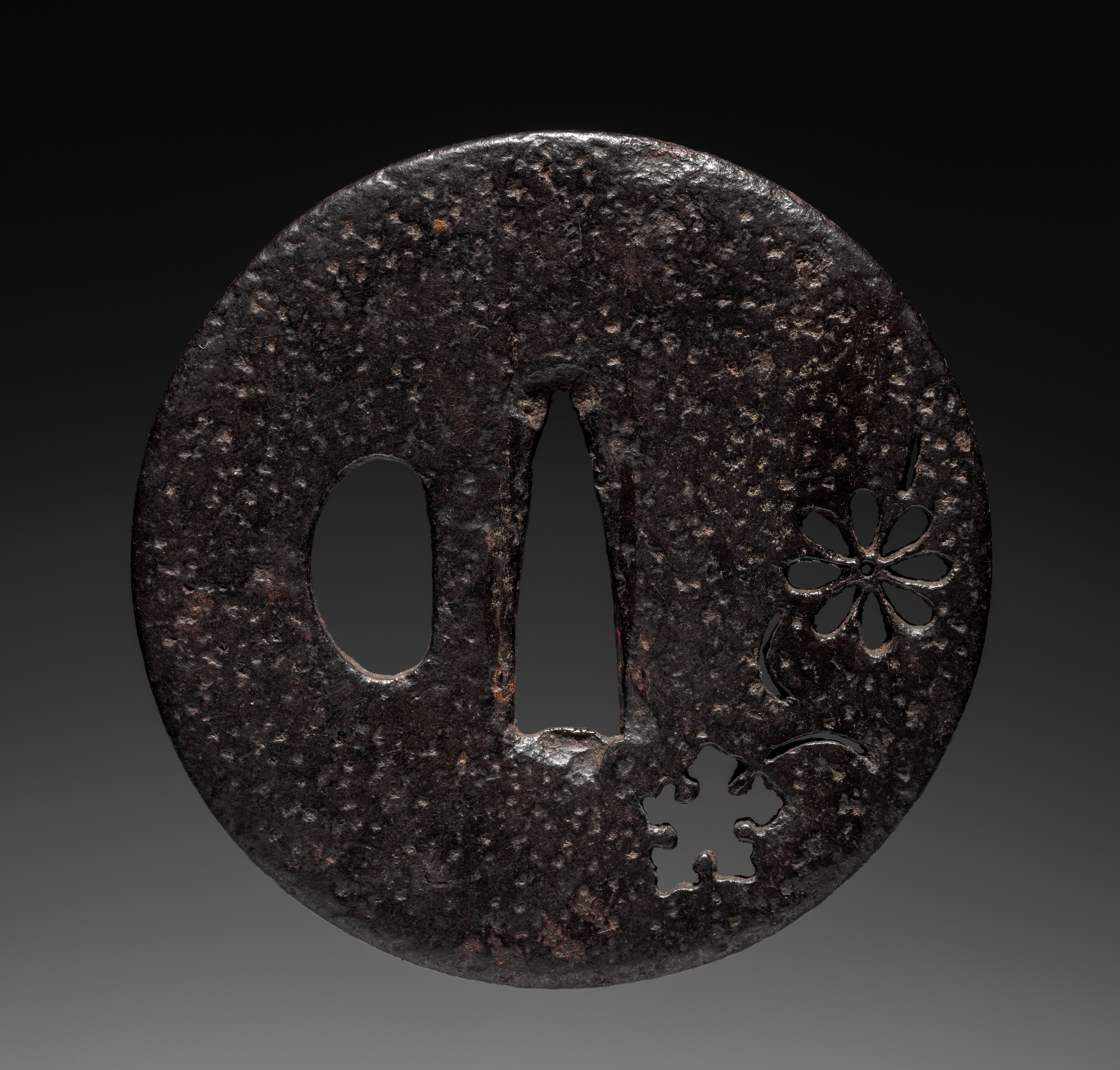A round, flat, dark brown metal object with a textured surface and small spots of lighter brown. The object has a large oval hole on the left side and a long, narrow, pointed hole to its right. On the right side of the object, there is a cut-out design resembling a flower with four rounded petals and a stem with two leaves. The background fades from black at the top to dark grey at the bottom. The object is a Sword Guard (Tsuba) with Flower.