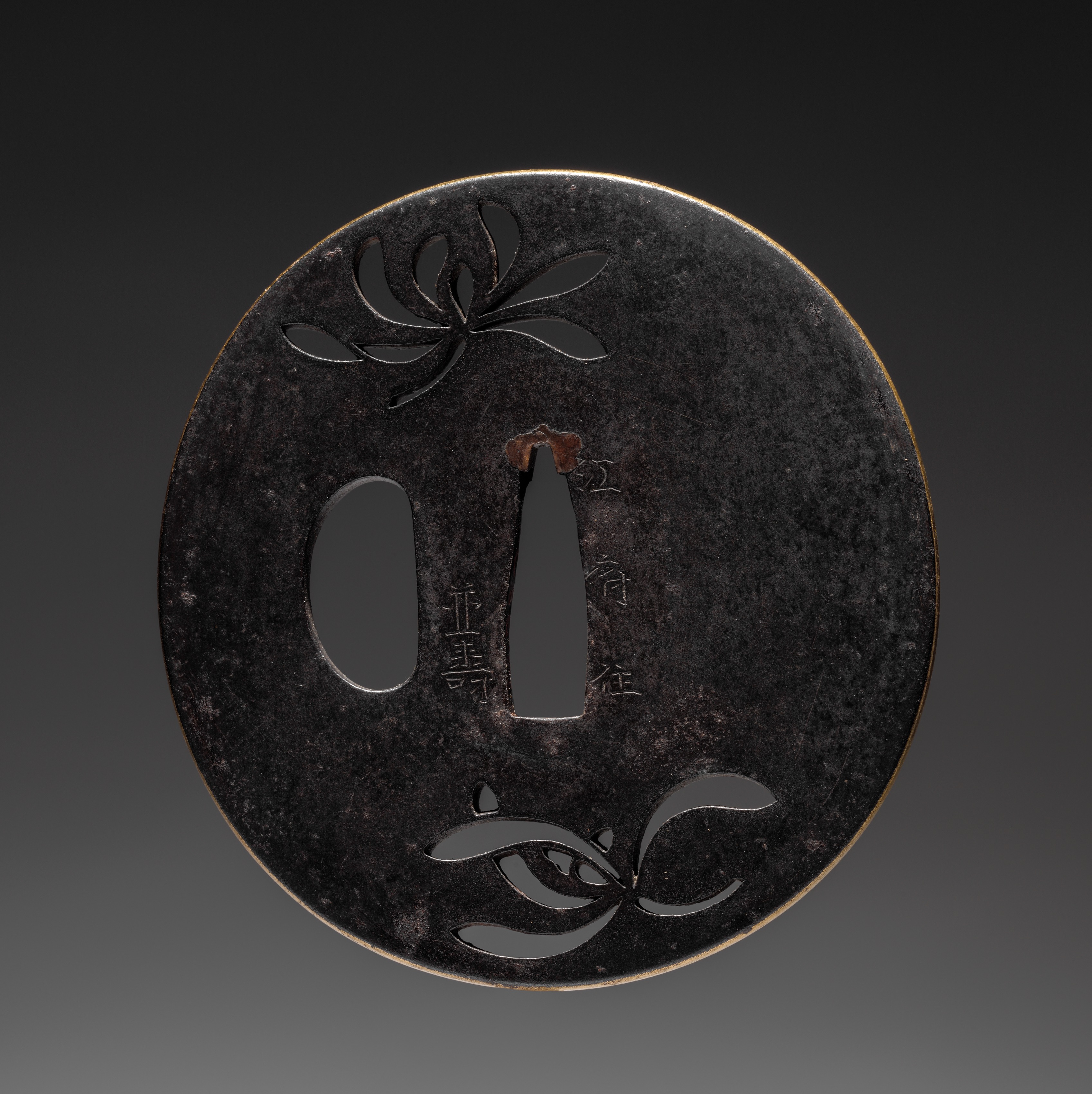 Round, dark gray metal object with a smooth edge. Two leaf designs, one at top and one at bottom. Central hole with oblong cutout to the left and tapered cutout to the right. Small, illegible text etched vertically to the right of tapered cutout. Metal has a weathered appearance. Background fades from dark at top to light at bottom. Title: Sword Guard (Tsuba), Artist unknown.