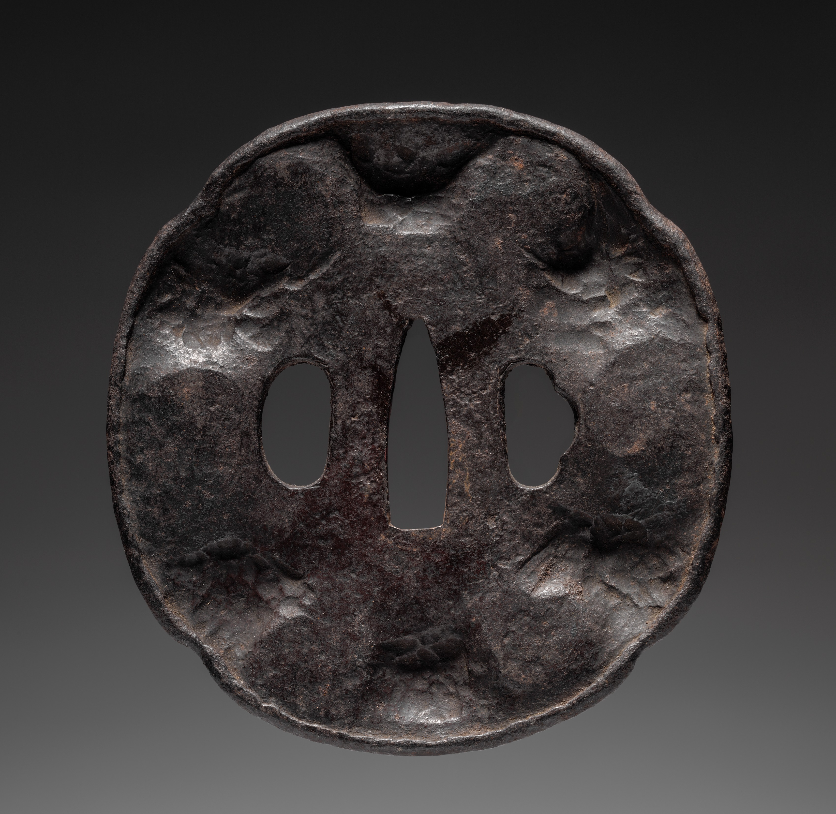 A sword guard (Tsuba) made of dark-colored metal with a textured surface and three holes; the central hole is elongated and the other two are irregularly shaped, with a rough, uneven edge. The object features a predominantly dark brown hue with areas of discoloration. The background is gray and fades to black.