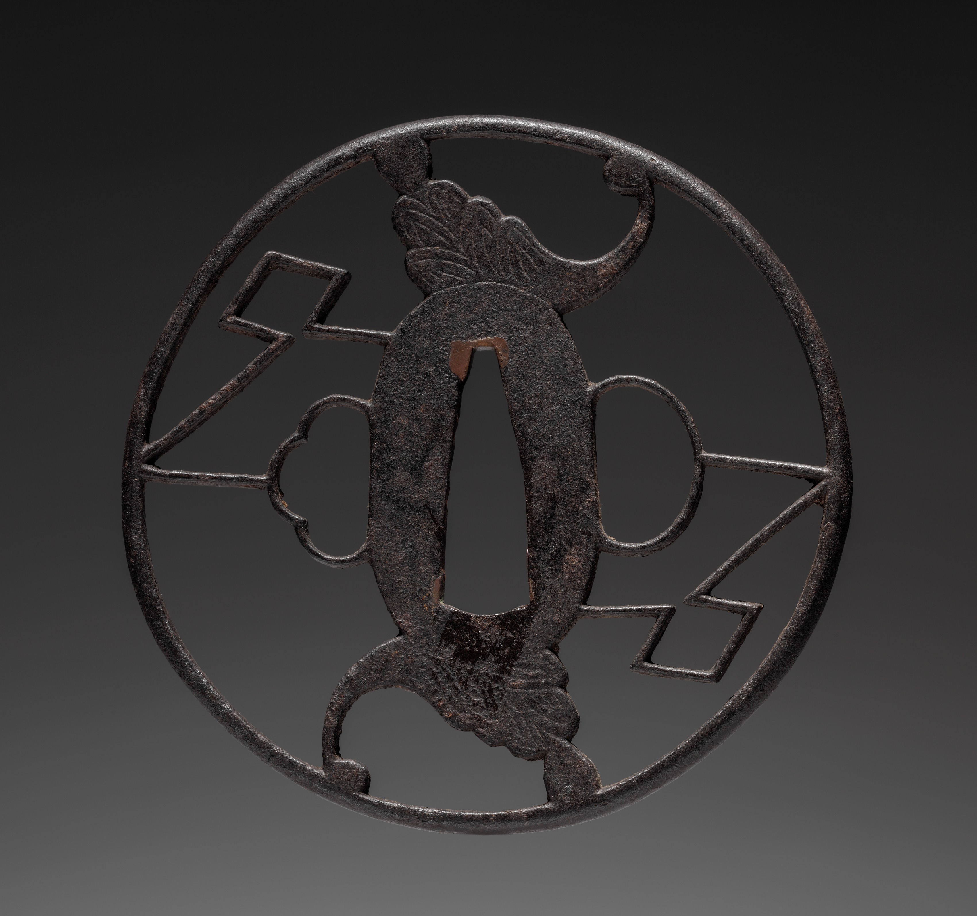 Dark brown metal object, circular shape with a central design; large oval shape with a pointed bottom; two curved leaf-like shapes protrude from top and bottom; two abstract shapes on either side; background transitions from dark to light gray. Sword Guard by artist unknown.