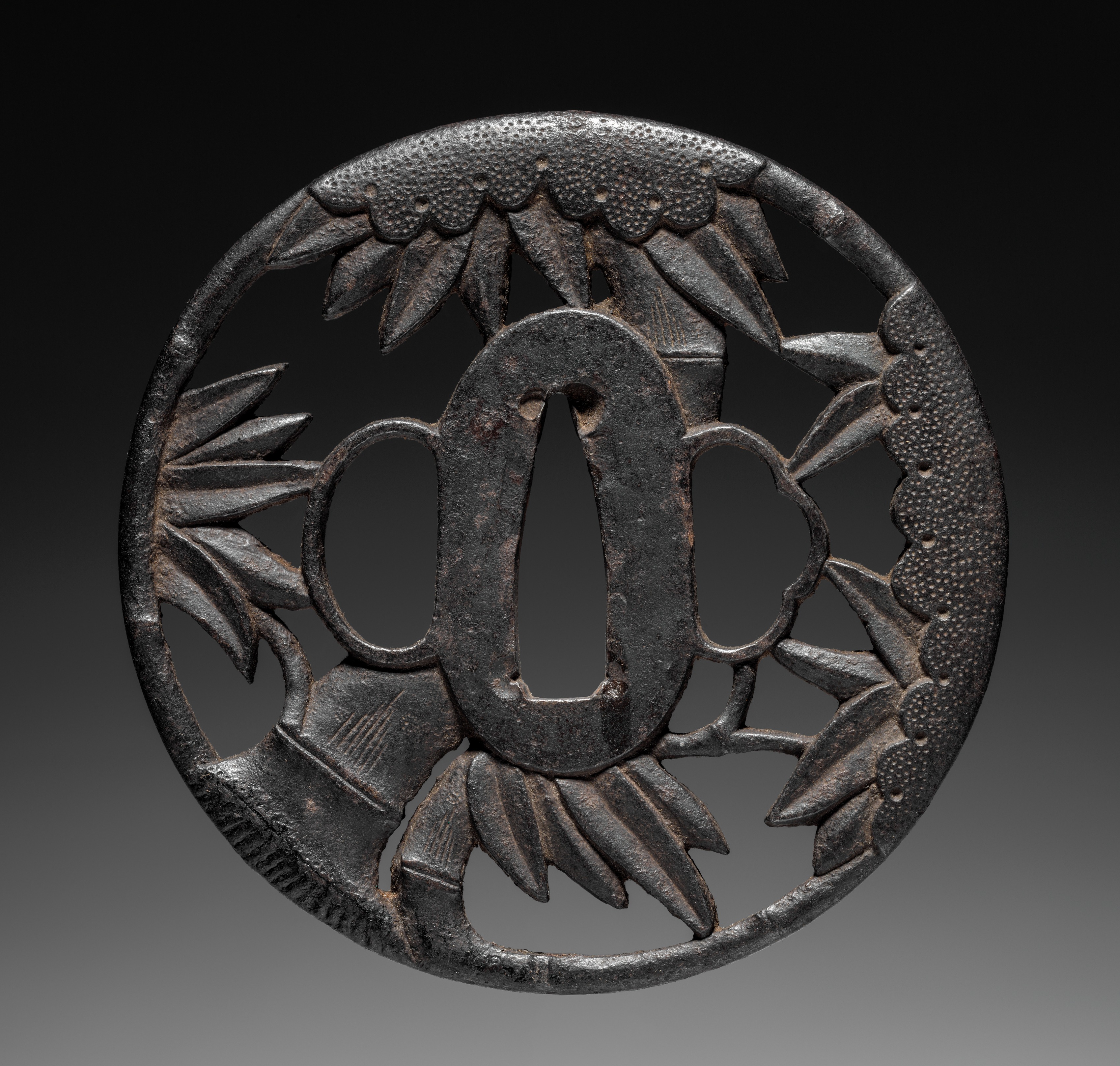 Round, dark gray metal object with a central teardrop-shaped cutout, flanked by two oval cutouts. The object features a design of bamboo and a cloud, crafted from a single piece of metal. The circular shape is punctuated by cutouts, and the surface exhibits a textured appearance. A scalloped edge at the top is adorned with small bumps. The design element on the bottom left resembles a bamboo stalk with leaves. A cloud-like motif is visible on the right side. The background transitions from black at the top to gray at the bottom. Sword Guard Tsuba with Bamboo and Cloud.