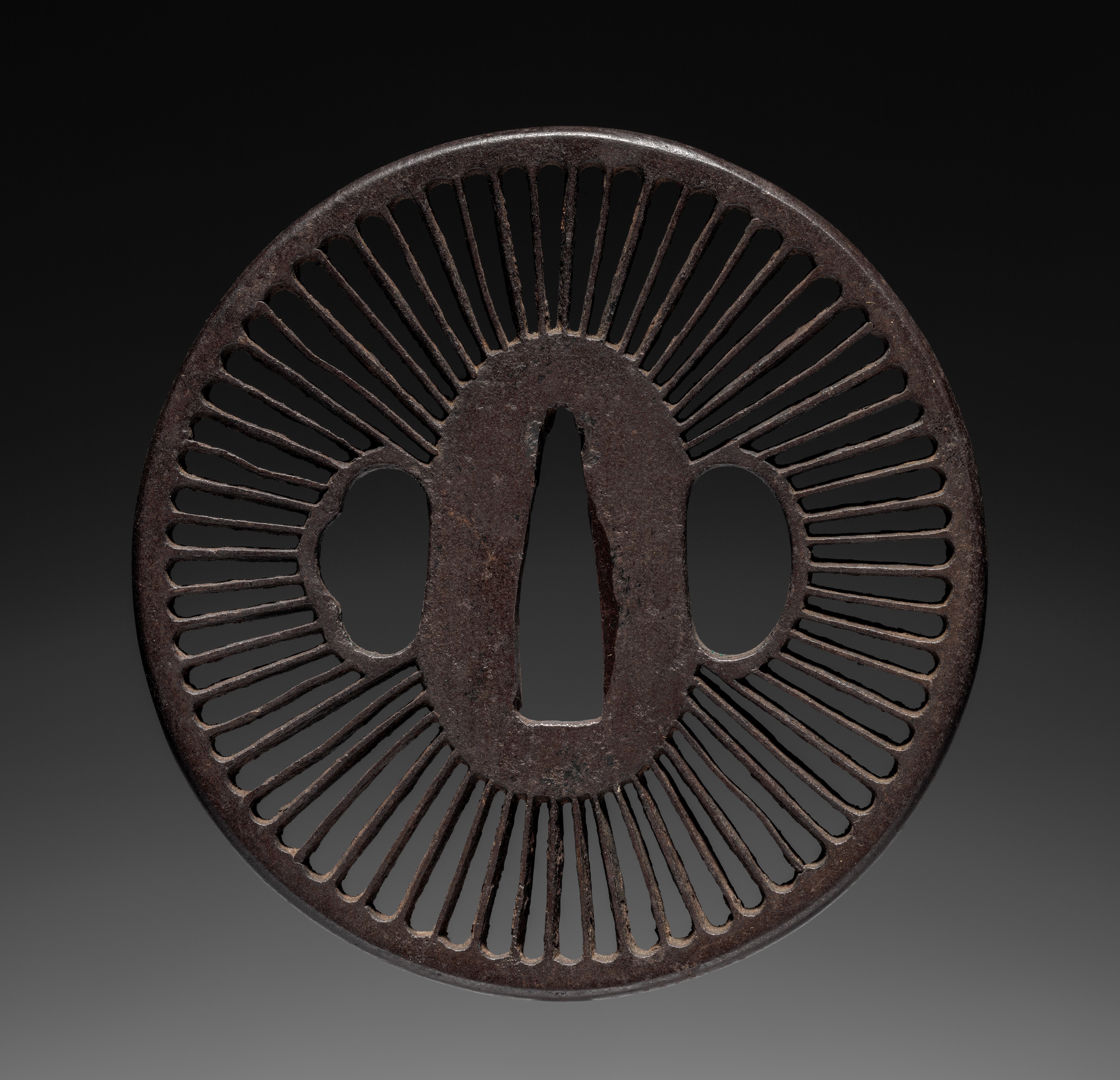 The image depicts the Tsuba, a sword guard, crafted by an unknown artist. The Tsuba is circular and made of dark brown metal, exhibiting a weathered appearance. It features a central oval shape with a teardrop-shaped cutout and two rounded oval cutouts on either side. Radiating from the central shape are numerous thin, elongated slits that extend outward in a sunburst pattern, covering the entire surface. The background transitions from black at the top to dark gray at the bottom.
