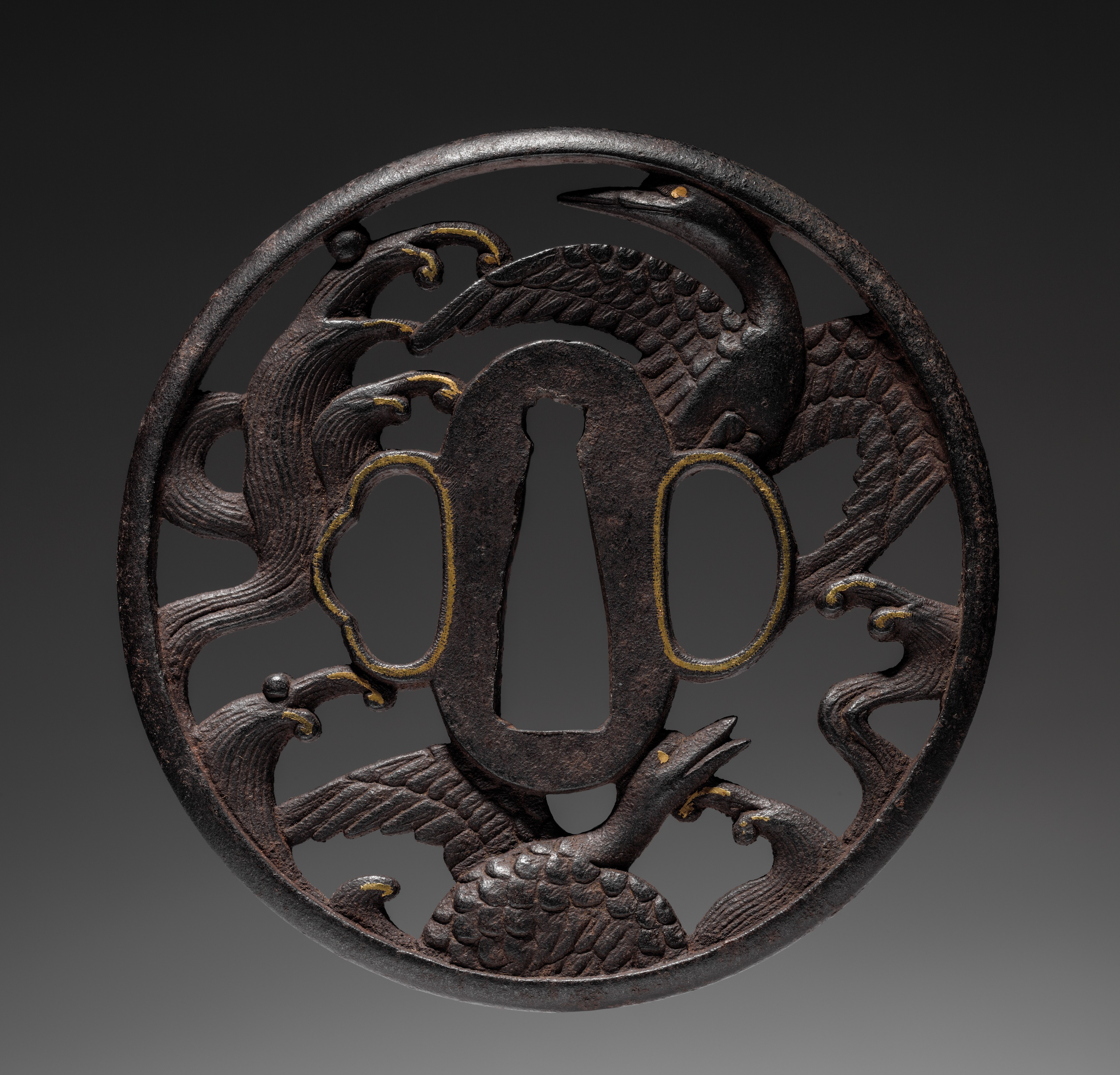 Sword Guard (Tsuba) with Carp in Waterfall and Bridge