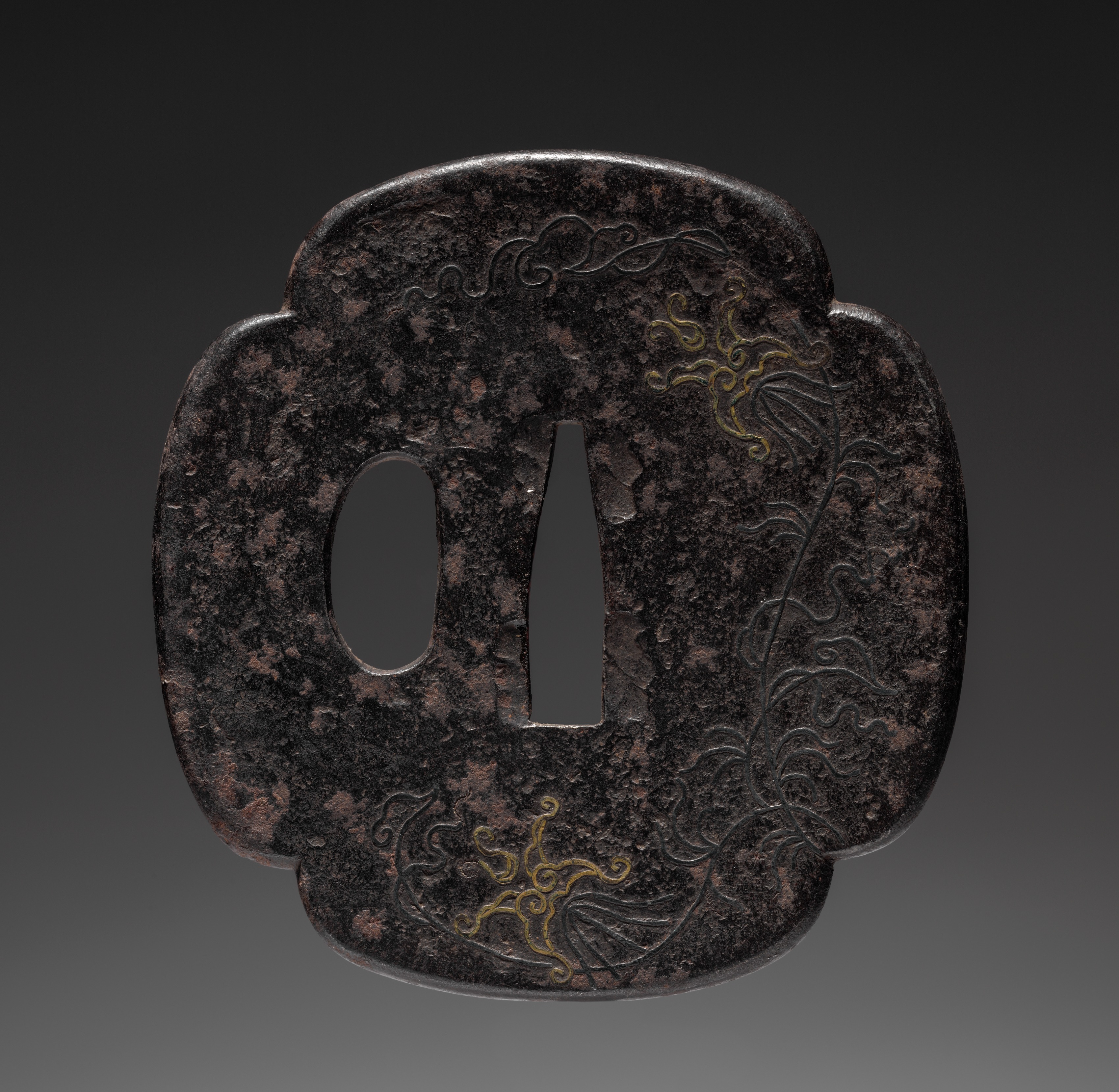 Dark brown sword guard with a marbled appearance and gold accents. The guard is shaped like a flower with rounded edges. Two openings are cut out in the center, one oval and one tapered. The surface features intricate engravings of swirling lines and floral patterns. Gold accents are used to highlight parts of the design. The background of the image transitions from dark gray to light gray. Sword Guard (Tsuba).
