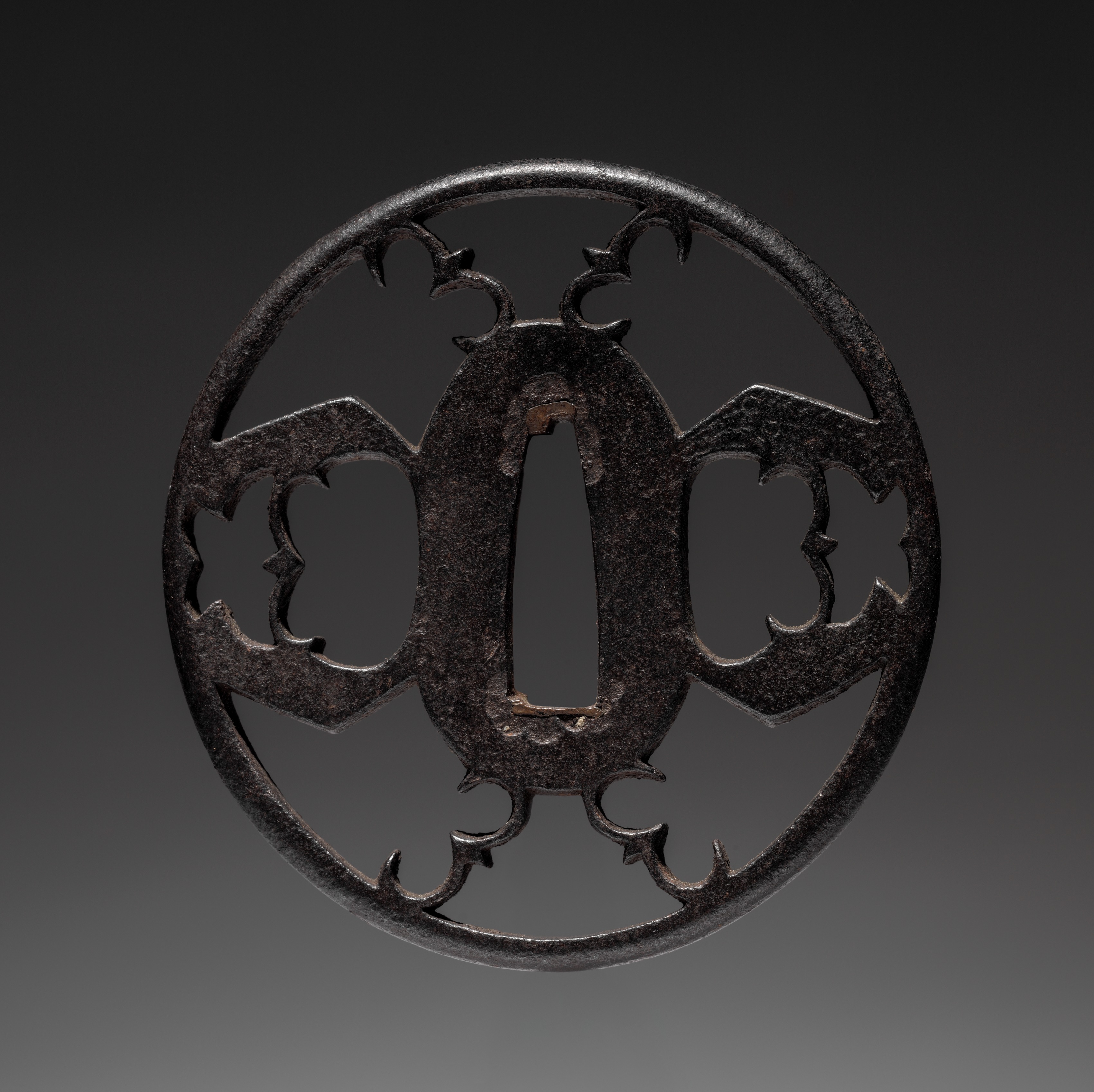 The image shows a round, dark brown sword guard with a central oval-shaped hole and a decorative design. The guard is made of metal and has a textured surface. The central hole is elongated and tapers to a point at the bottom. On either side of the central hole are two symmetrical designs that resemble leaves or petals. The outer edge of the guard is also decorated with a series of curved protrusions. The background of the image is a gradient of dark gray to light gray. Sword Guard (Tsuba).