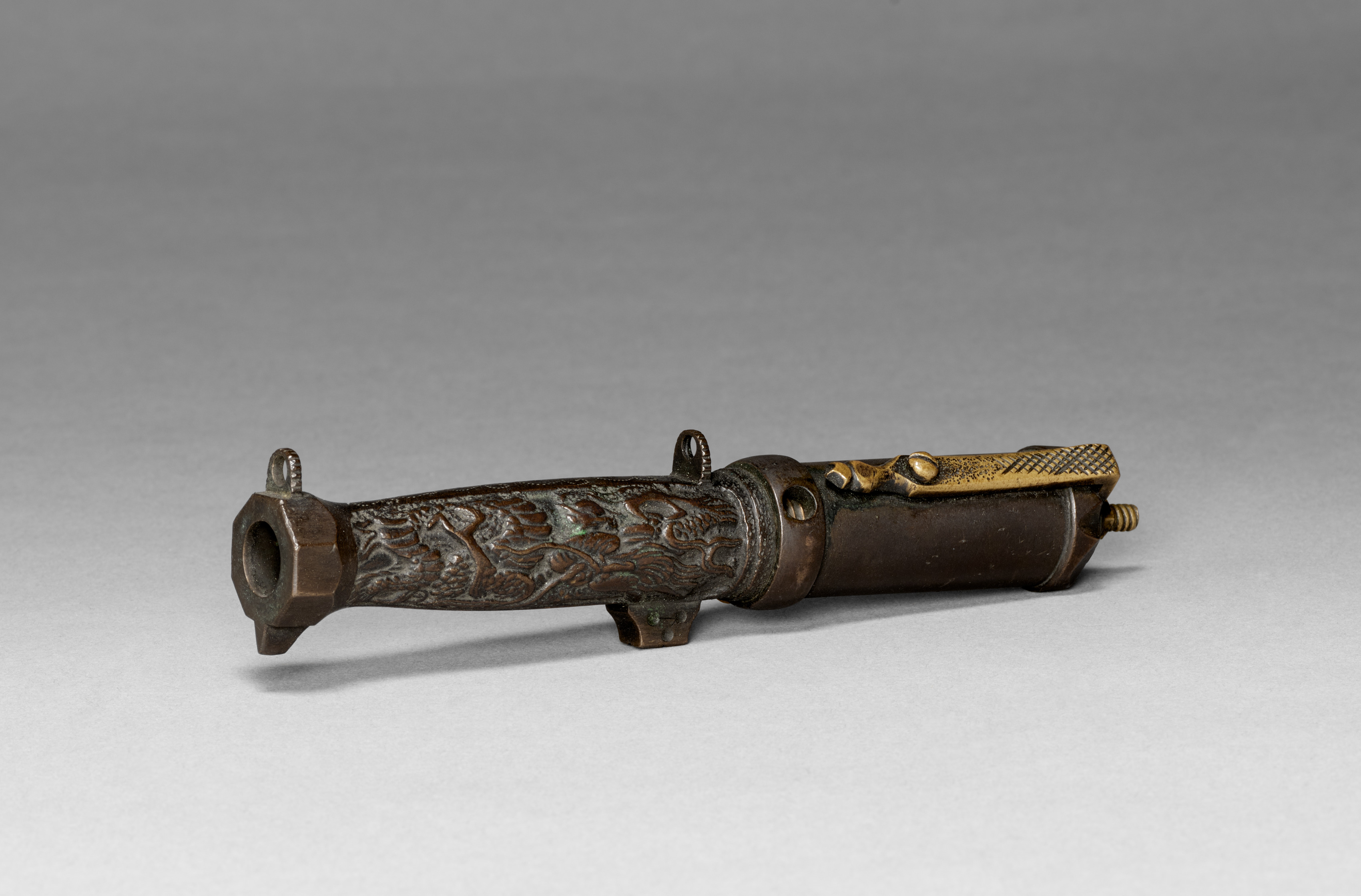 The image shows a Hand Cannon by an unknown artist. The cannon is made of bronze with an intricate design. The cannon is cylindrical with a wide nozzle at one end and a handle at the other. The nozzle has a rounded rectangular shape with a circular opening. Two small loops are on top of the cannon, one near the nozzle and one near the handle. The handle has a gold-colored metal piece attached to it, which appears to be a trigger or firing mechanism. The body of the cannon has an ornate design, with a mix of raised and recessed patterns. The background of the image is a plain gray color, with a slight shadow underneath the cannon. The cannon sits on a flat surface. The overall appearance of the cannon suggests that it is an antique or historical piece.