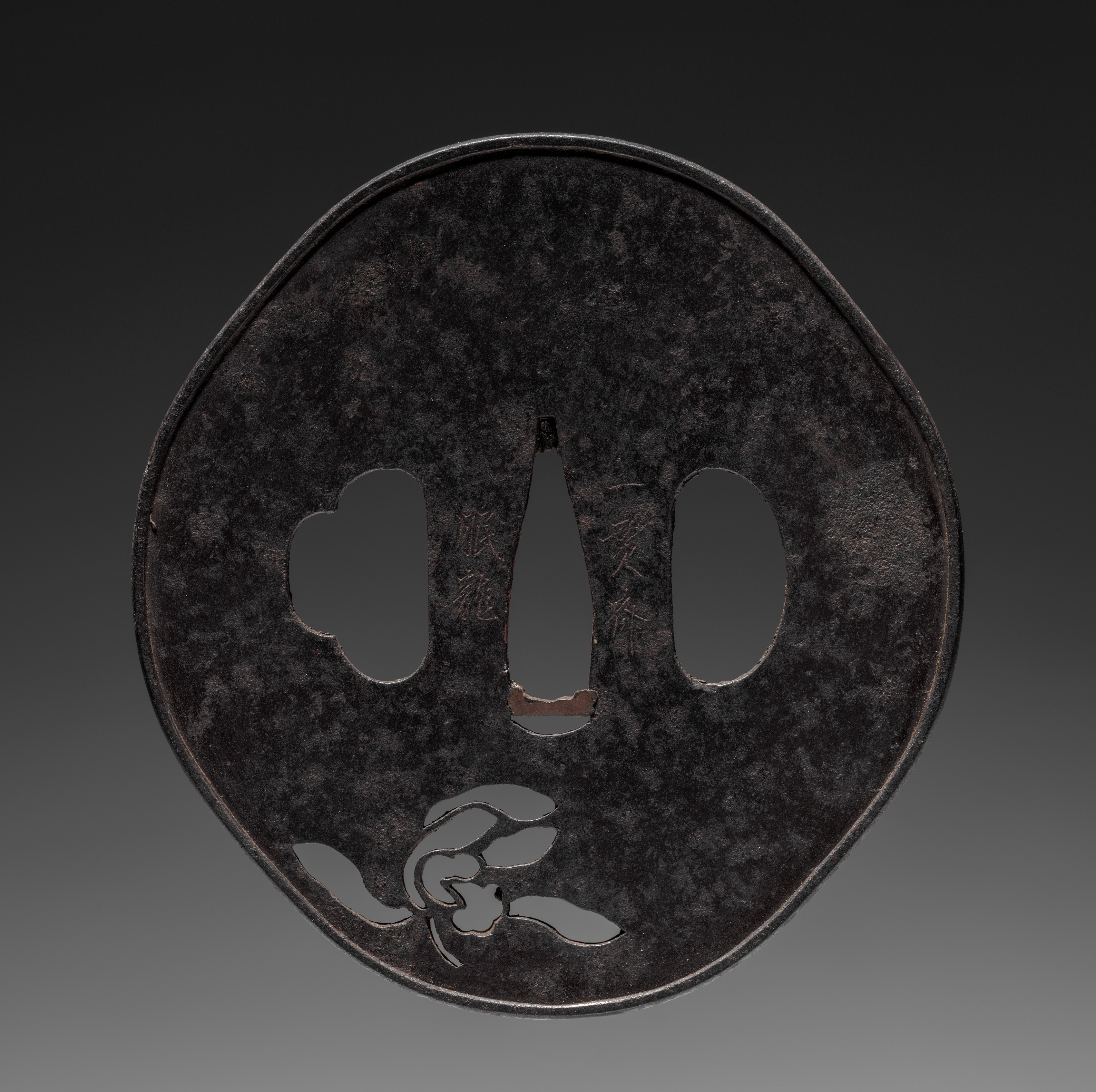 The Sword Guard, created by an unknown artist, is a circular dark-colored metal object with a marbled appearance. The object has a thin raised border around its edge. There are three cut-out shapes in the center: a clover-shaped cut-out on the left, a long teardrop-shaped cut-out in the middle, and an oval-shaped cut-out on the right. A stylized flower design is located at the bottom. The background of the image transitions from dark at the top to light gray at the bottom.