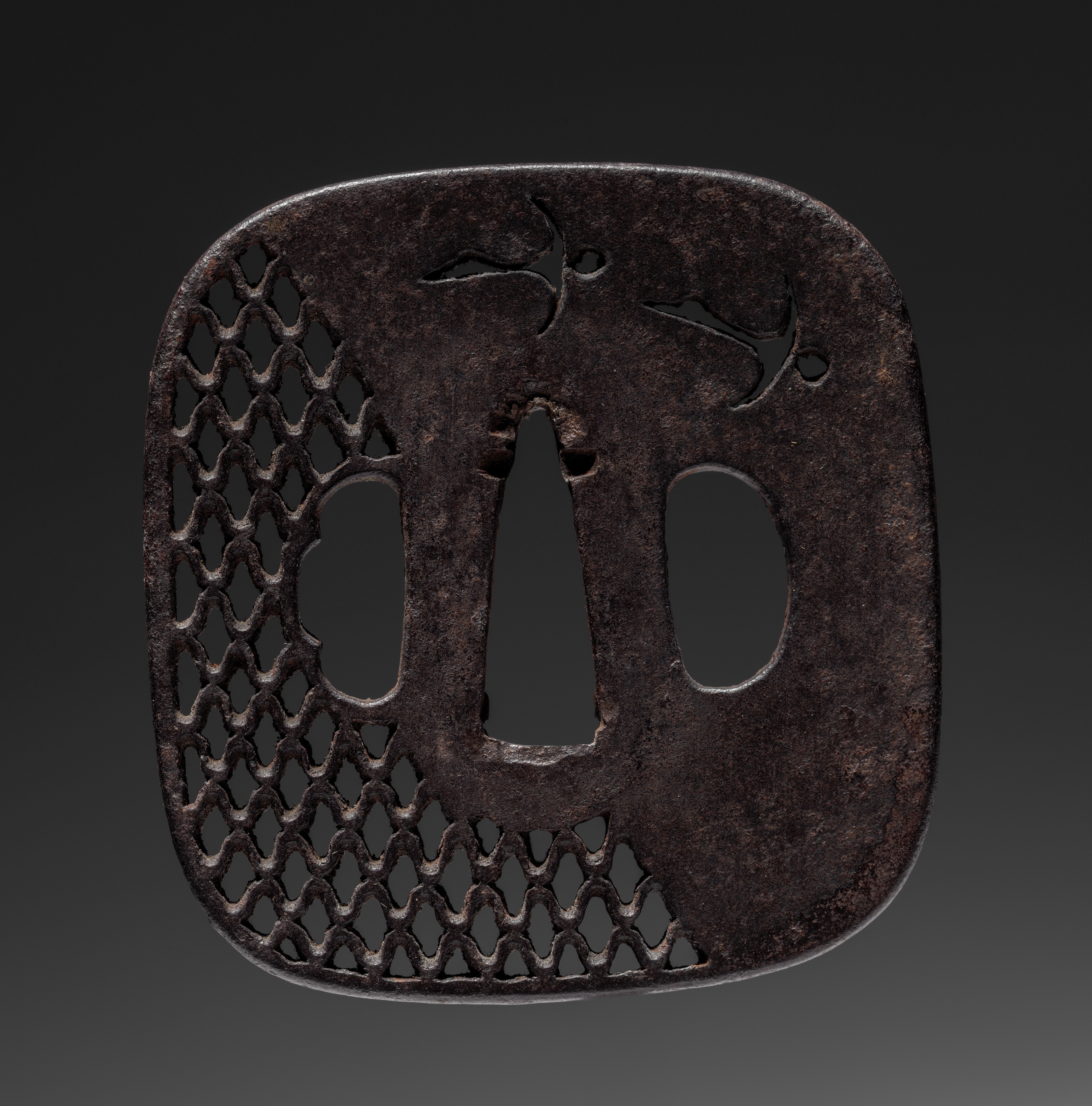 Dark brown sword guard with rounded square shape, featuring a lattice pattern on left half and two oval cutouts with a teardrop-shaped cutout in the center, against a dark background. Sword Guard by artist.
