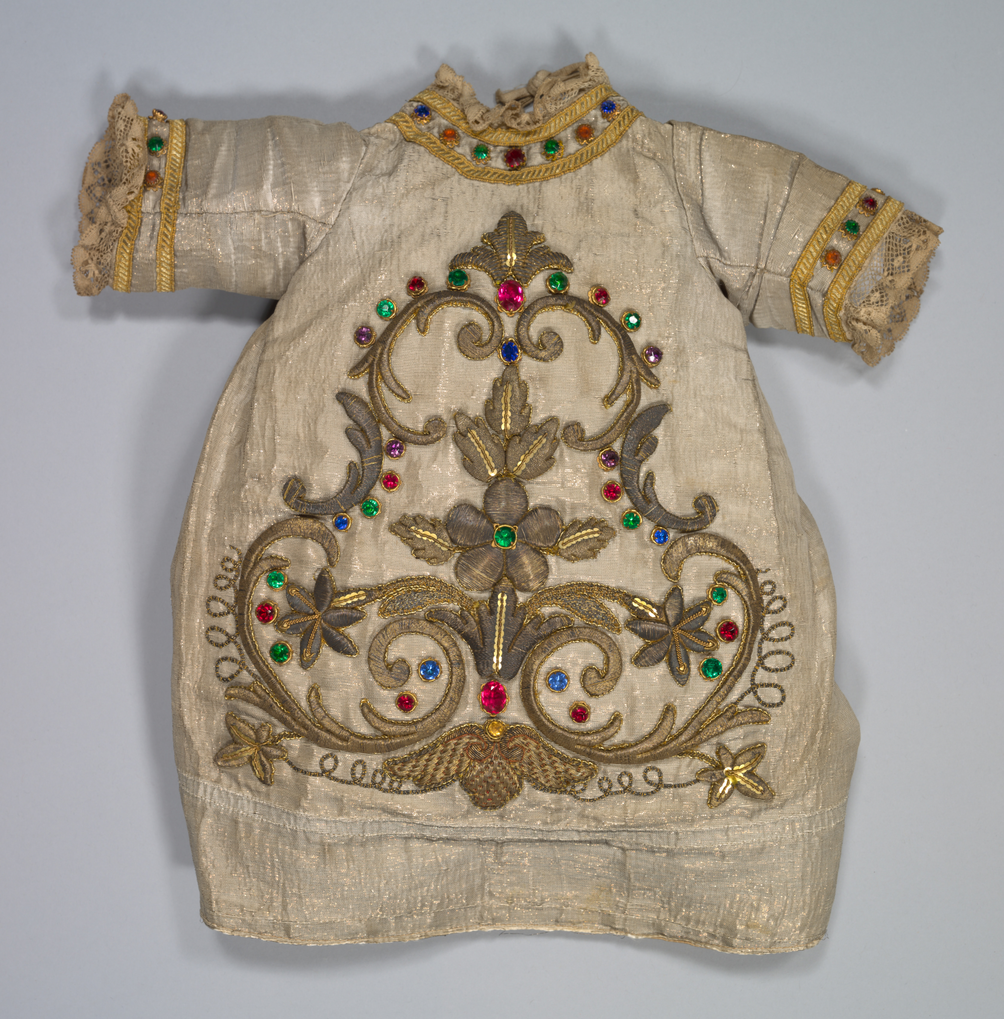 The Baby's Robe by artist is a short-sleeved, cream-colored garment with a high neckline. The robe has gold trim along the neckline and sleeves. There are colorful jewels and gold embroidery on the front, forming a symmetrical floral design. The sleeves have lace trim at the ends. The robe appears to be made of a textured fabric, possibly linen or silk. The background of the image is light gray.